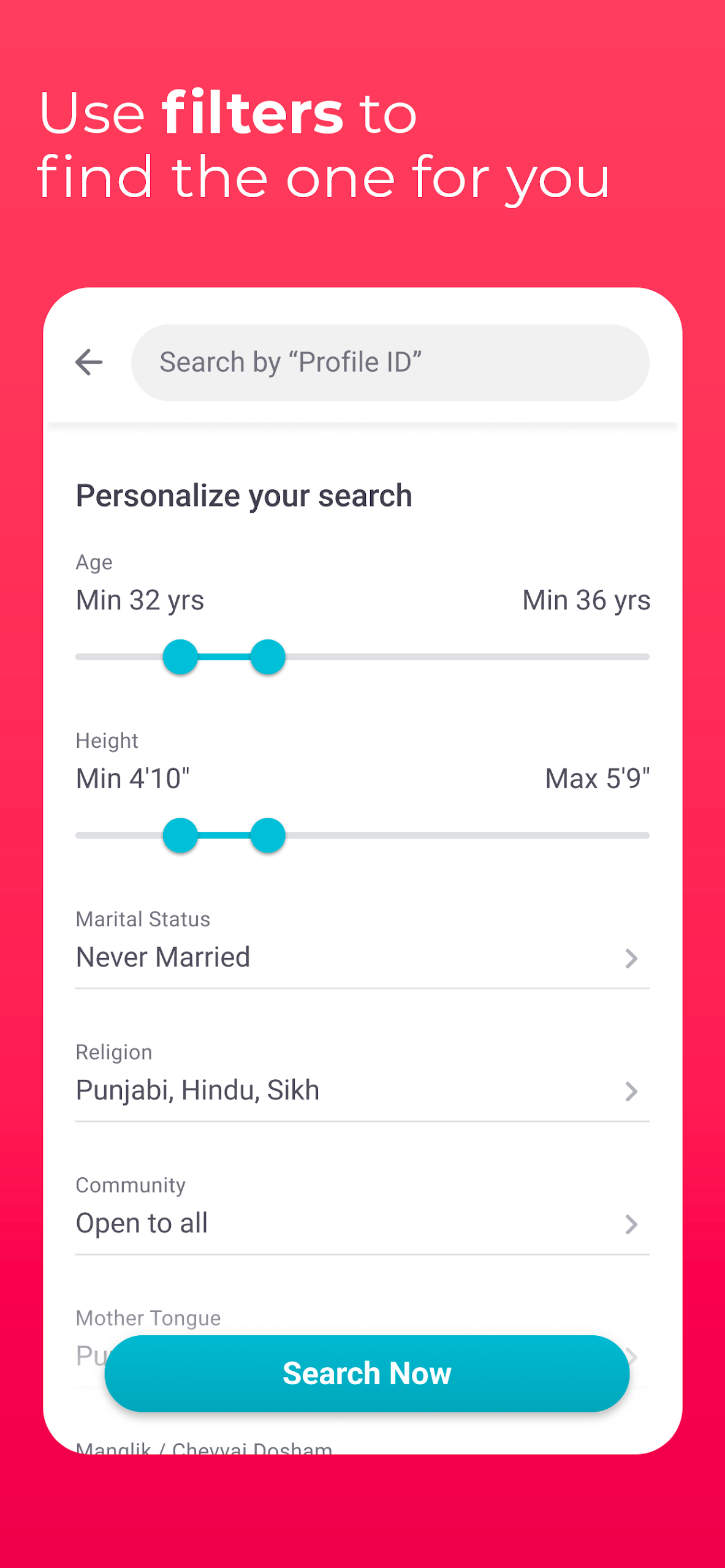 This makes it simple and easy for you to search for brides/grooms around you and filter it by community, city & profession.