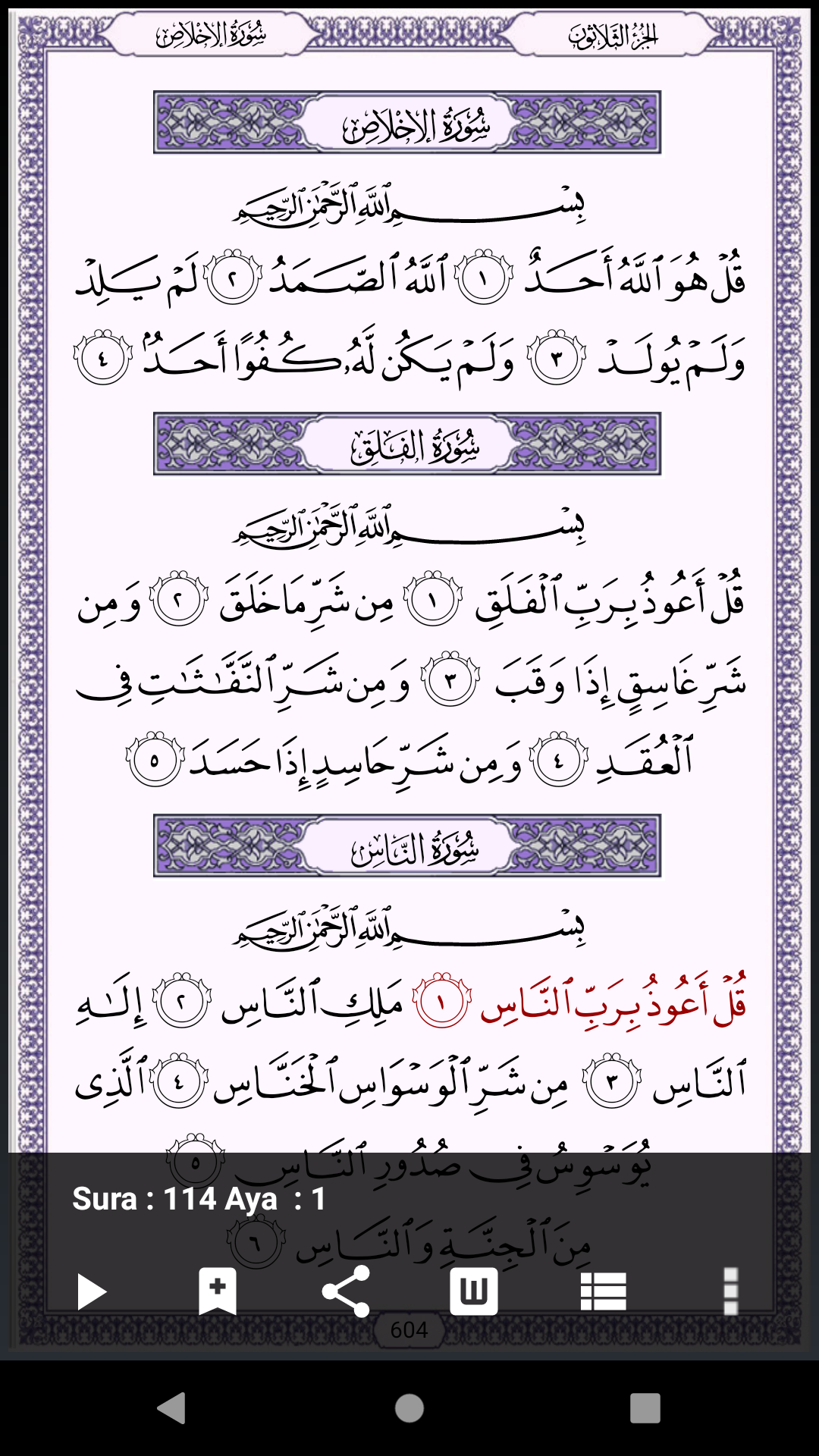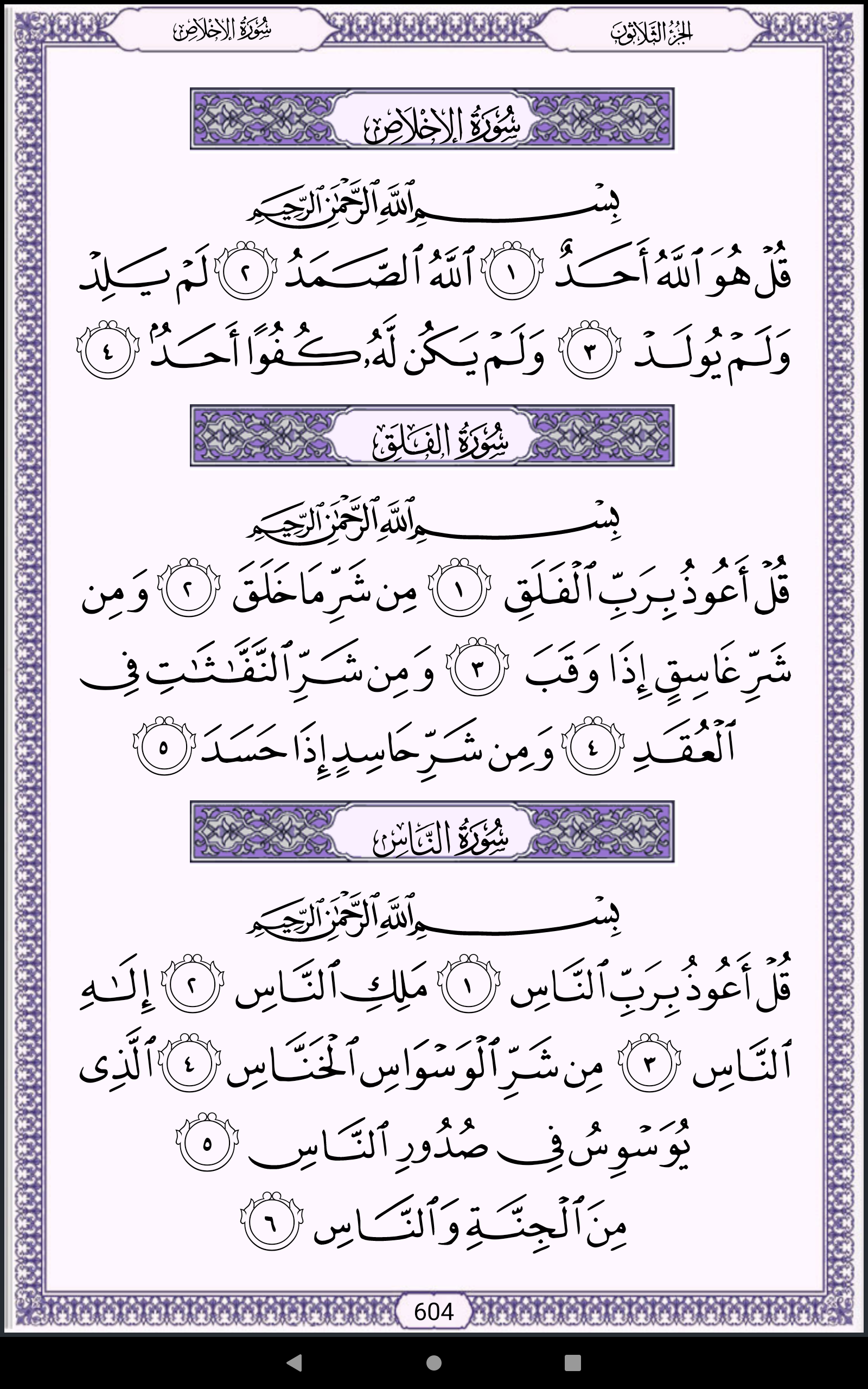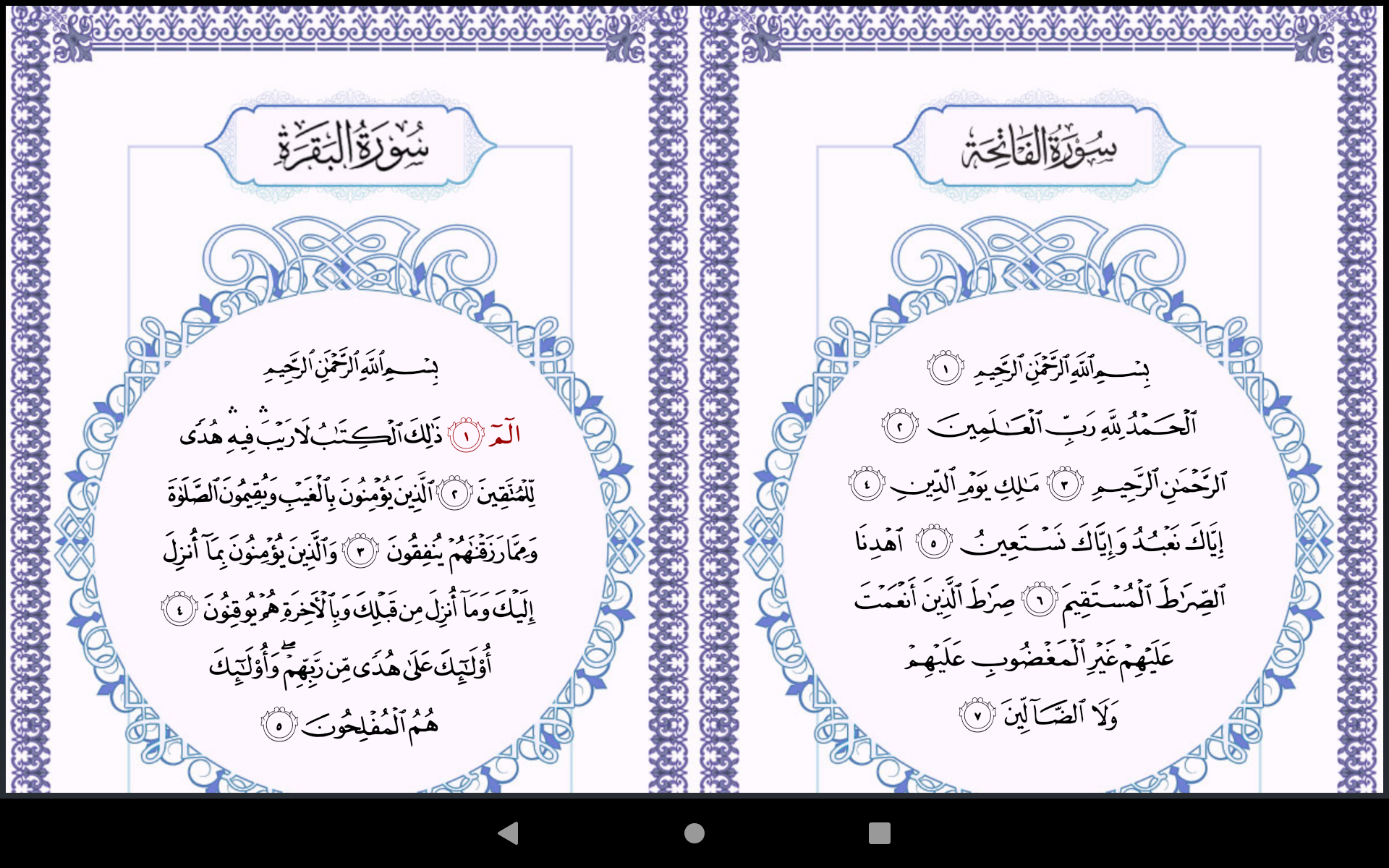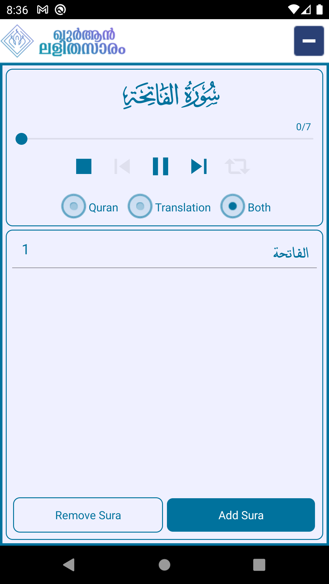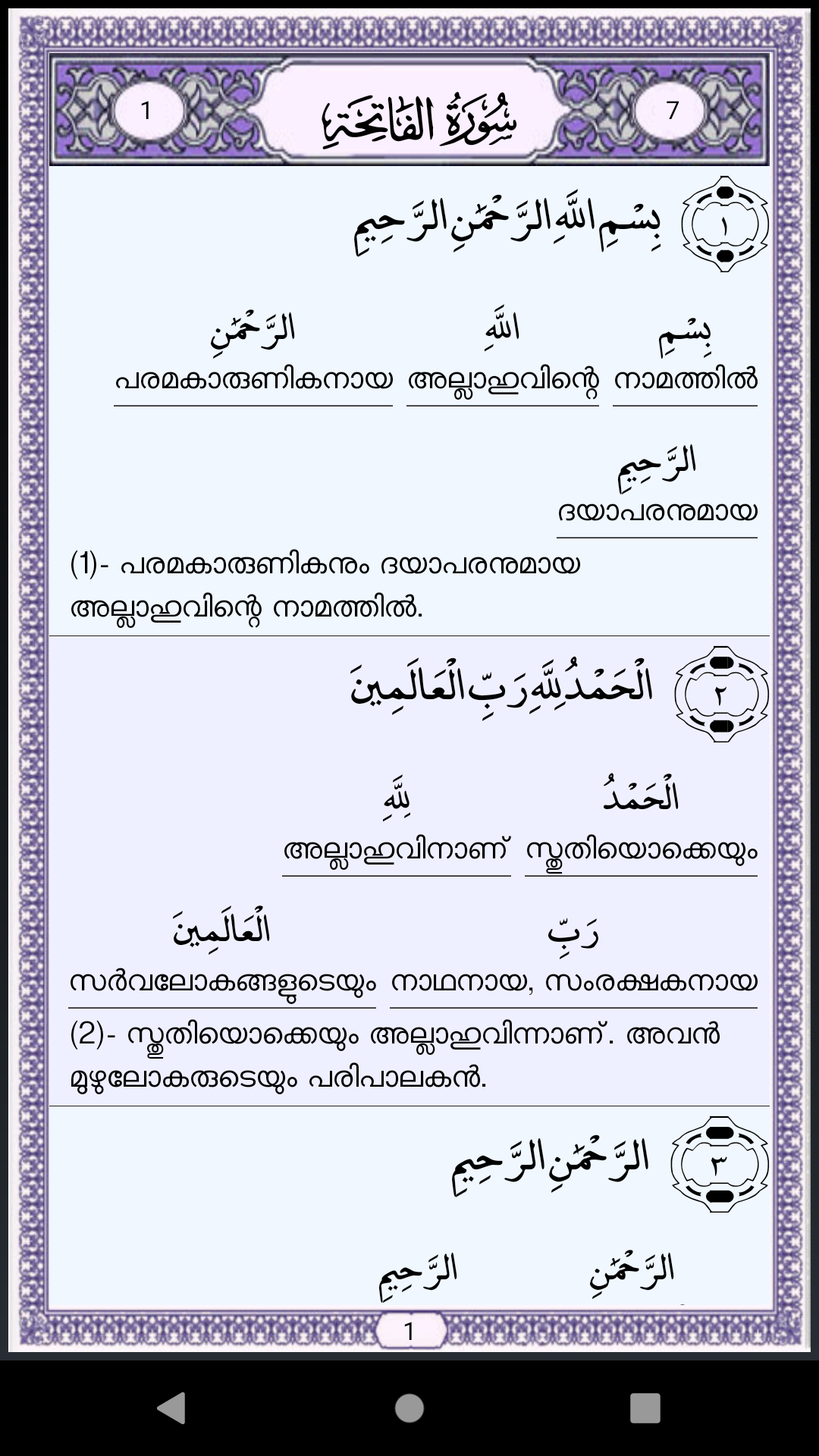 · The full Quran along with the Lalithasaram transcript is presented by default in a ListView format.