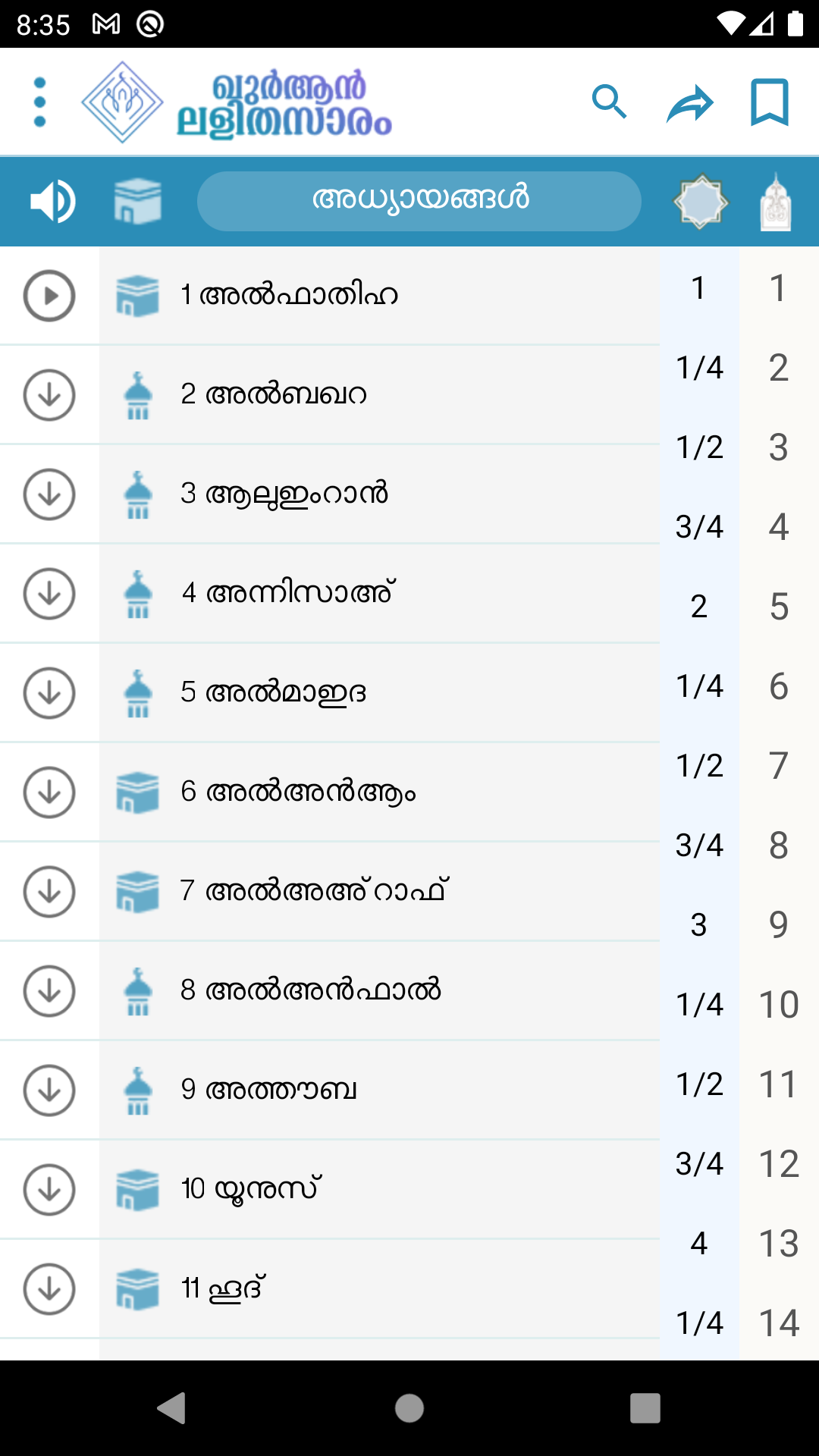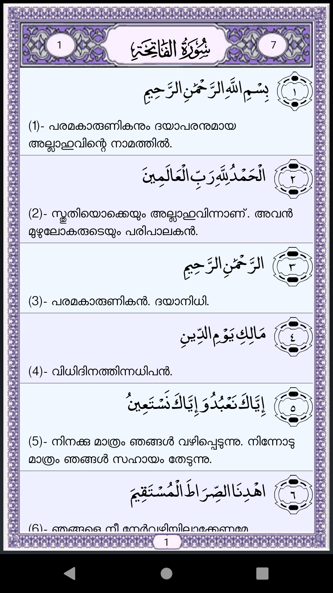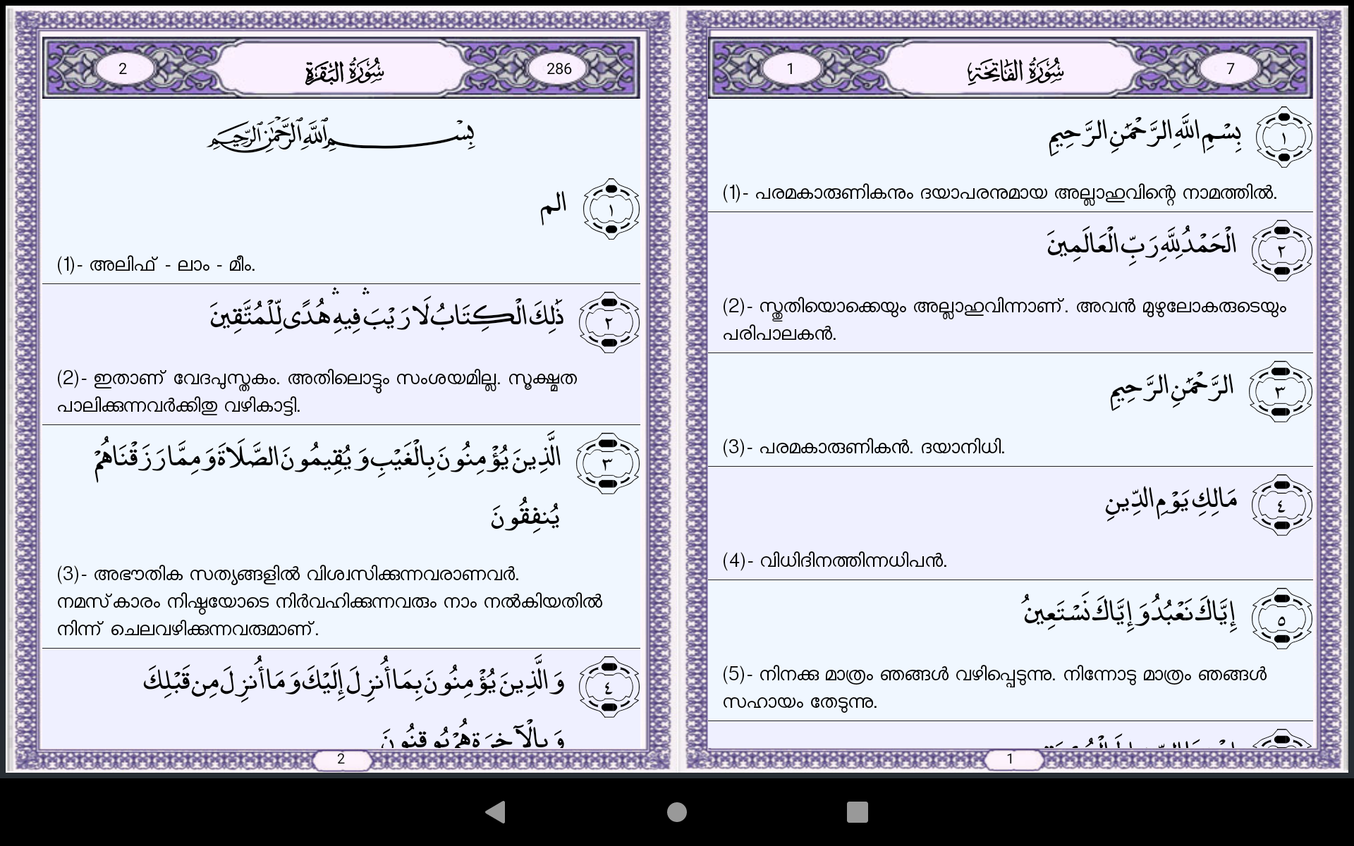 · A visually appealing and straightforward index allowing selection of Sura, Juzh, and Hizb in both Malayalam and Arabic.