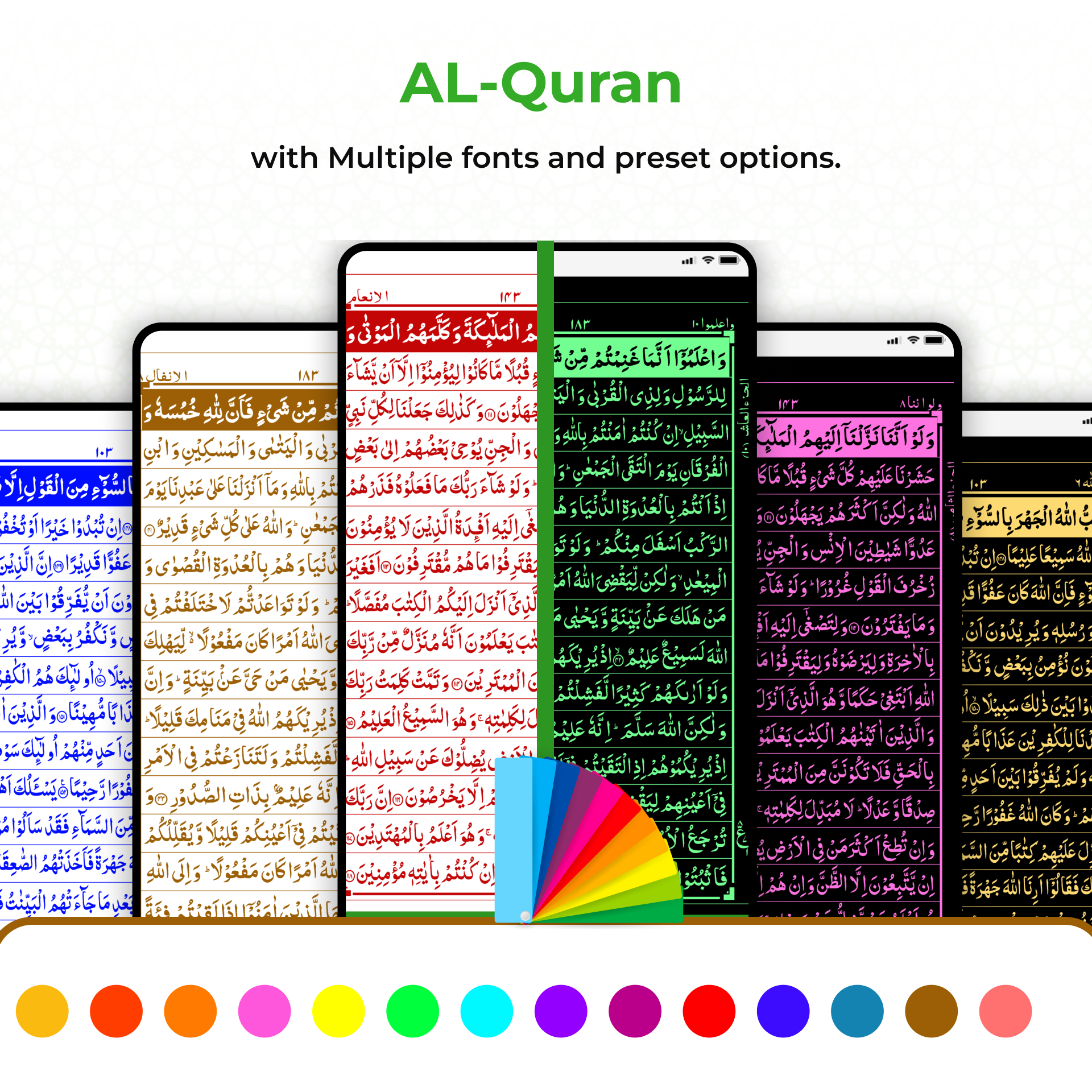 • Quran Sharif listen and read presents diverse page presentations and writing designs, featuring colorful Quranic Arabic Talawat.