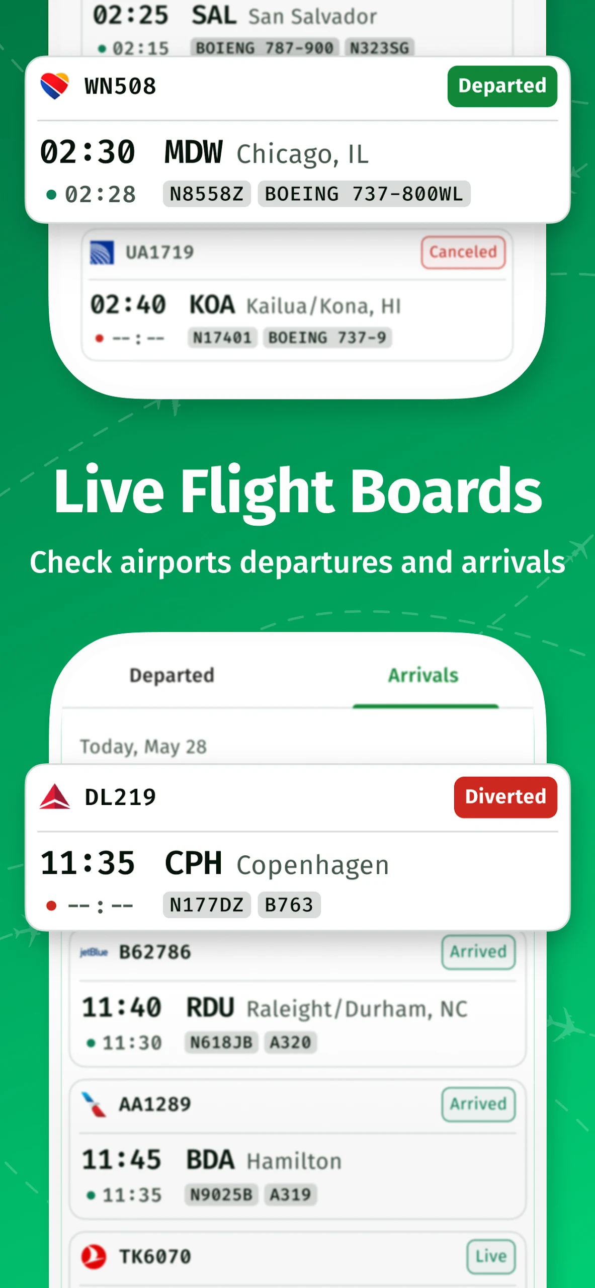 - Access individual live flight details and view an aircraft photo of any airborne plane.