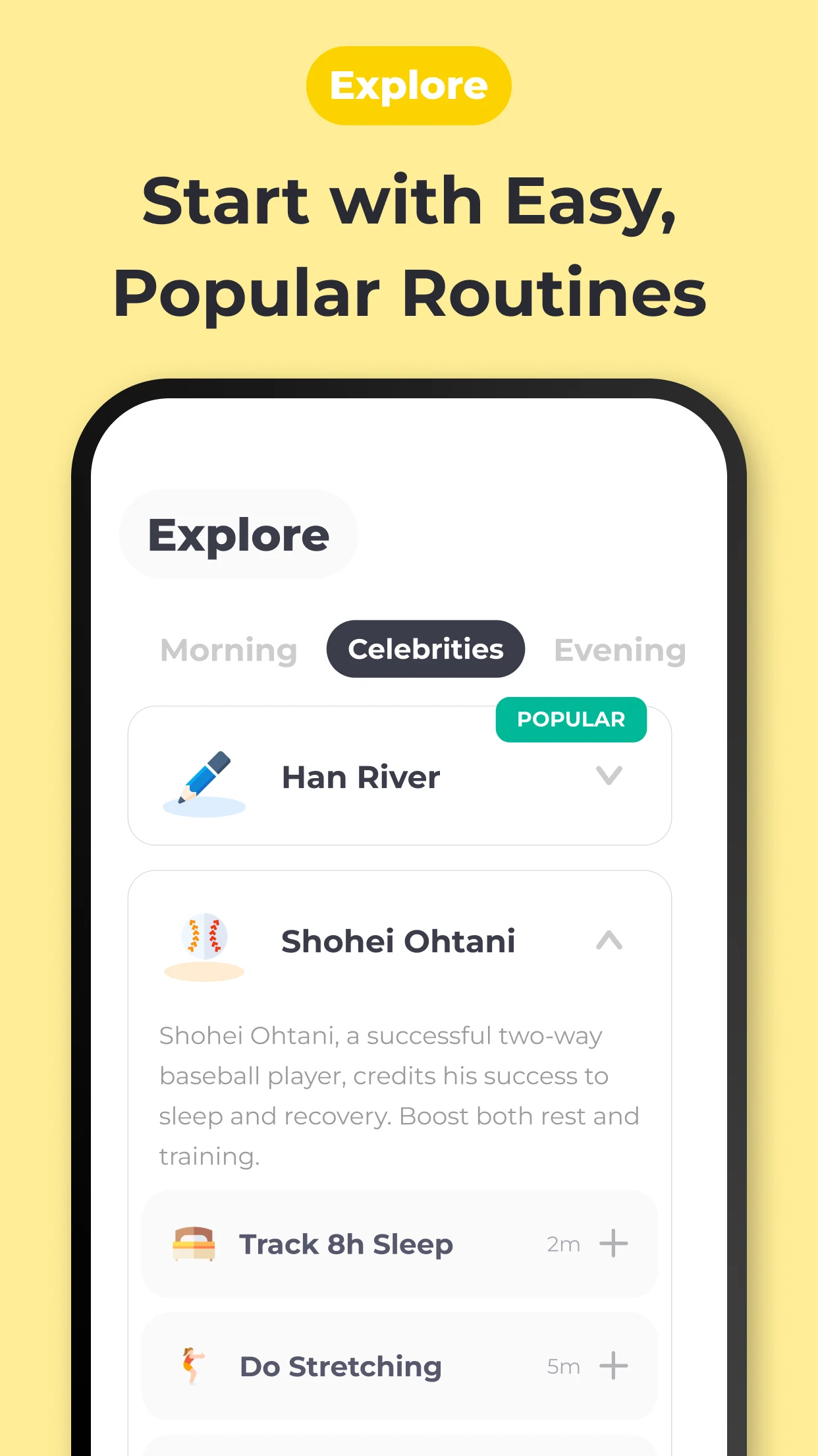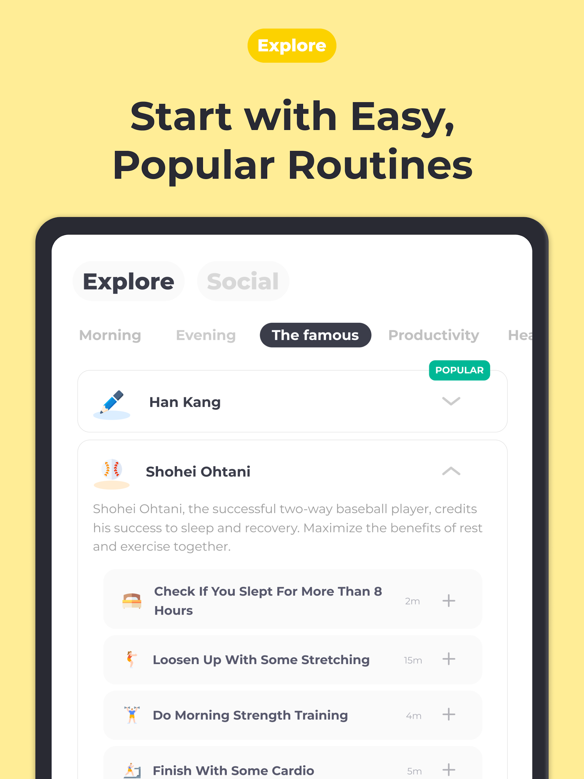 ㆍCheck out routines recommended by famous figures like Tim Ferriss or Dwayne Johnson to enhance your self-care routines with reminders.