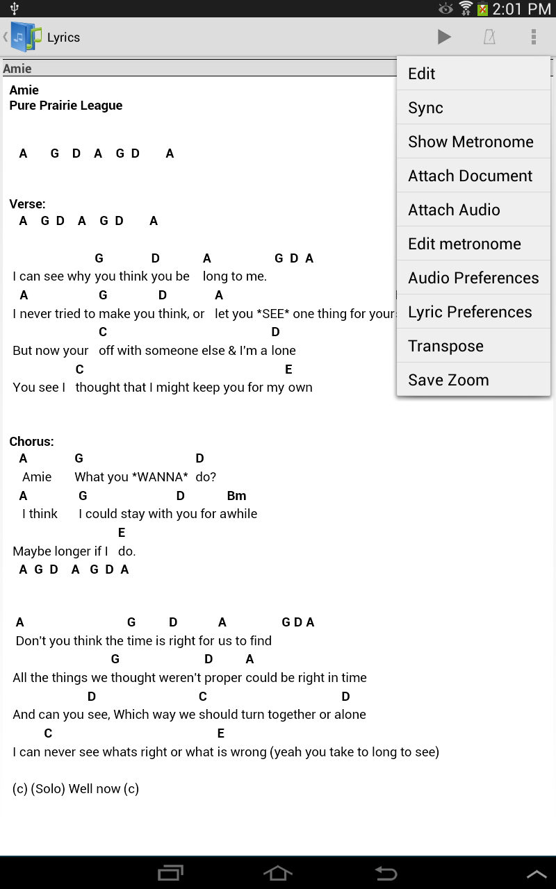 Add lyrics to a song by touching on the song. A menu will appear. Select the “Lyrics” menu button.
