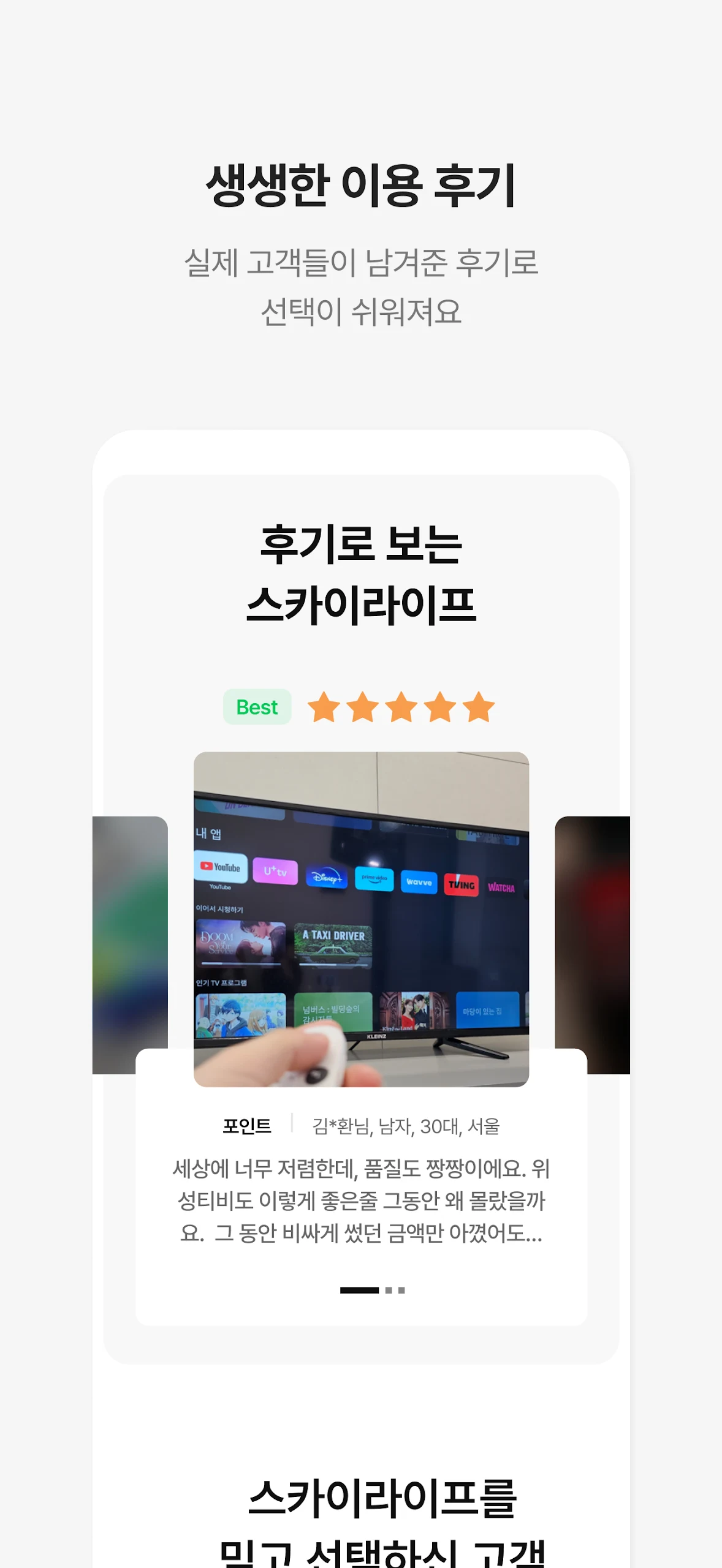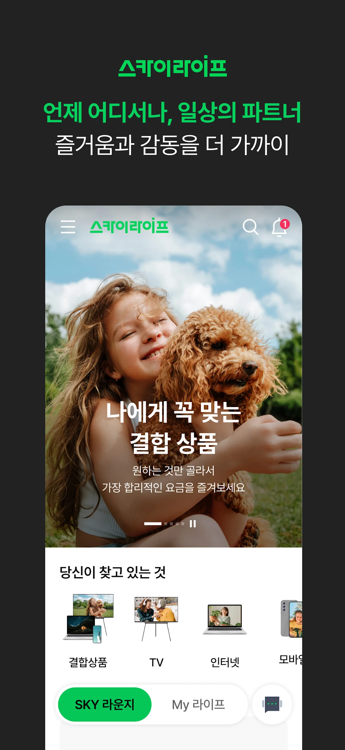Skylife (KT Skylife) is a South Korean satellite and pay-TV operator offering TV and OTT content, combined cable/wireless services, and ultra-high-definition broadcasting. Users can view and change plans, request after-sales service, change their address, access customer support, and obtain emergency protection services through its mobile app. Recent UI/UX improvements make the user experience more intuitive and convenient.