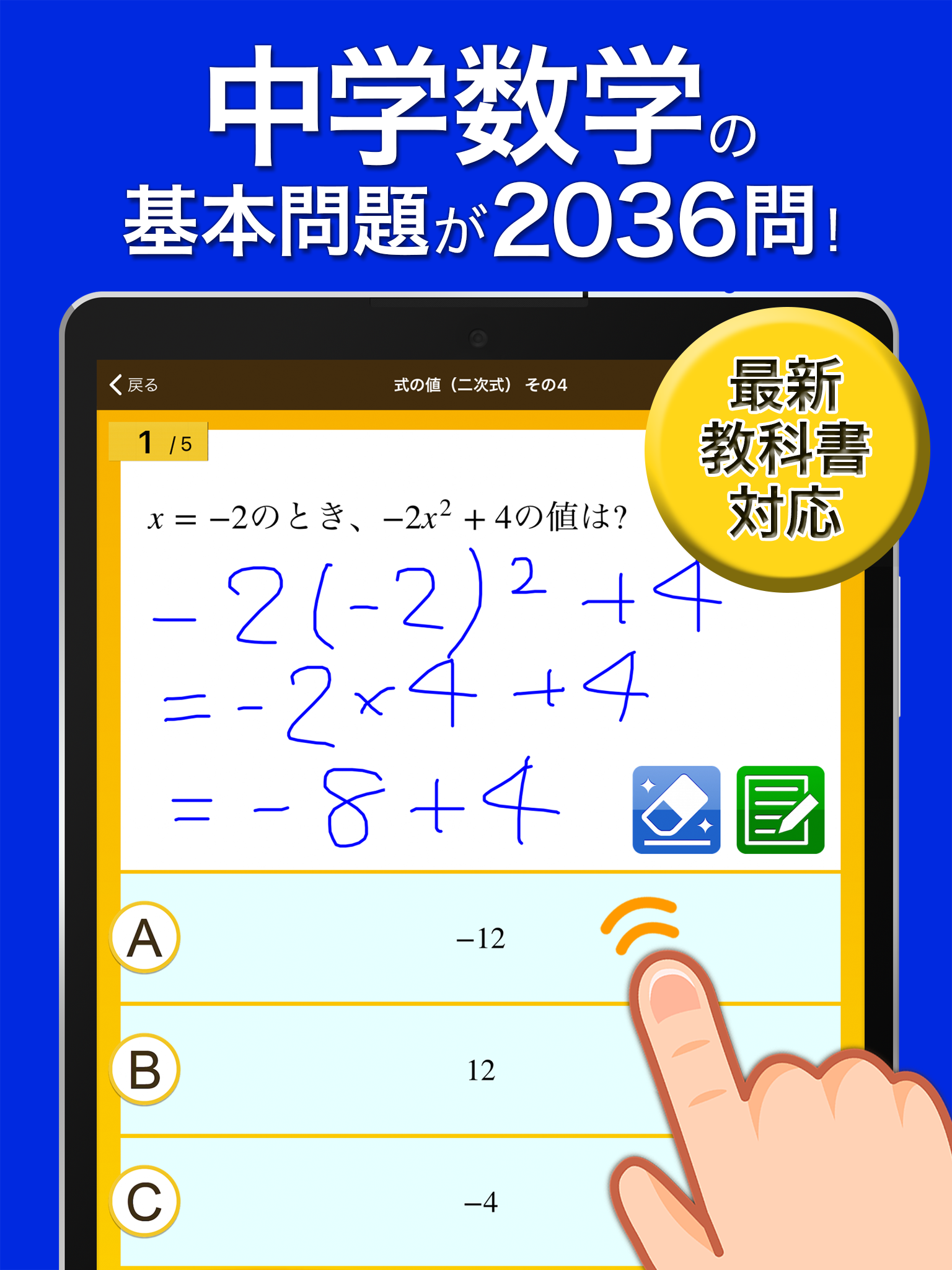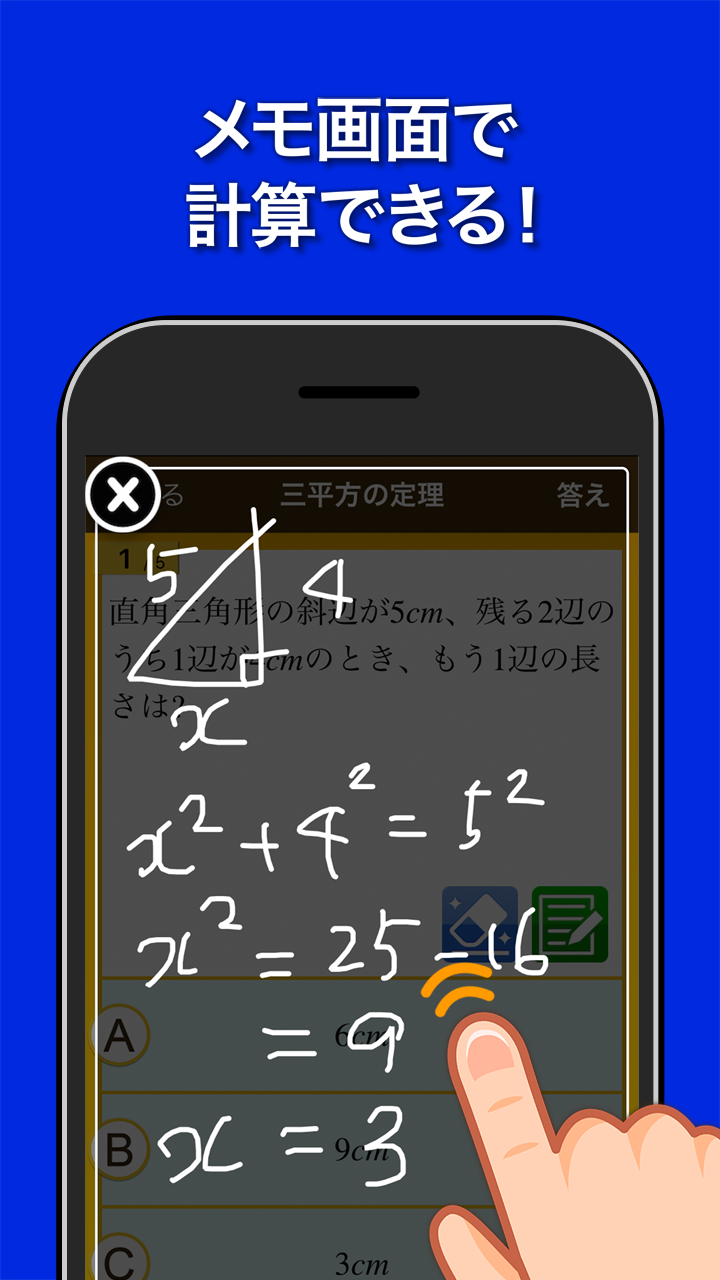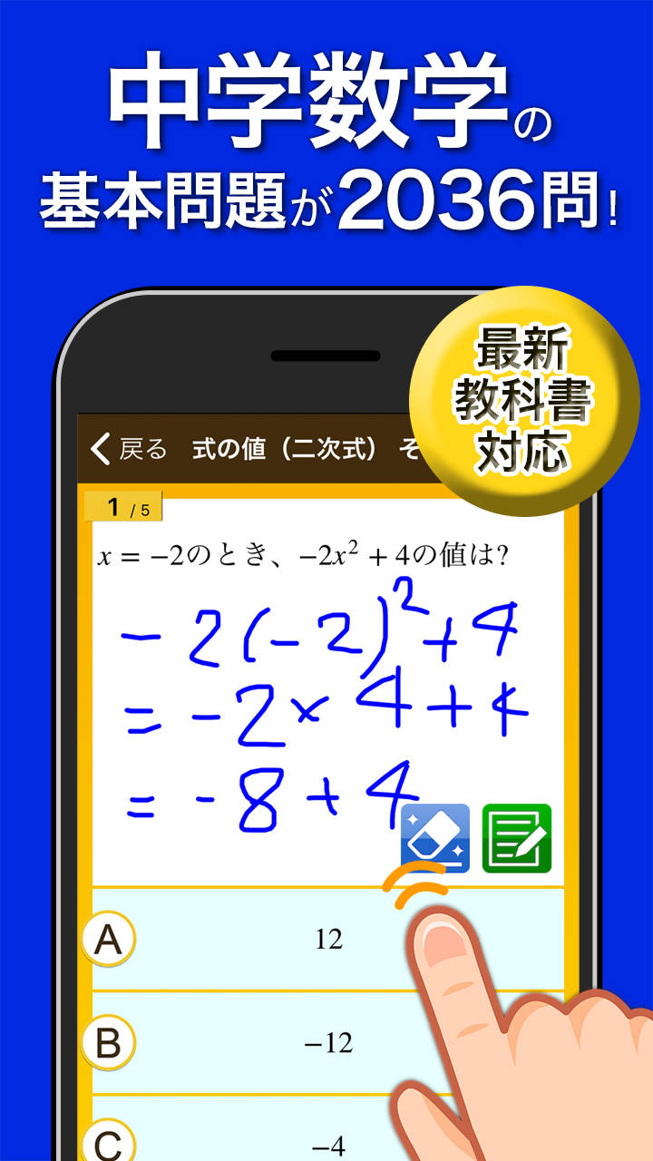 Users can practice solving problems across various topics covered in junior high, including equations, functions, geometry, probability, and data usage.