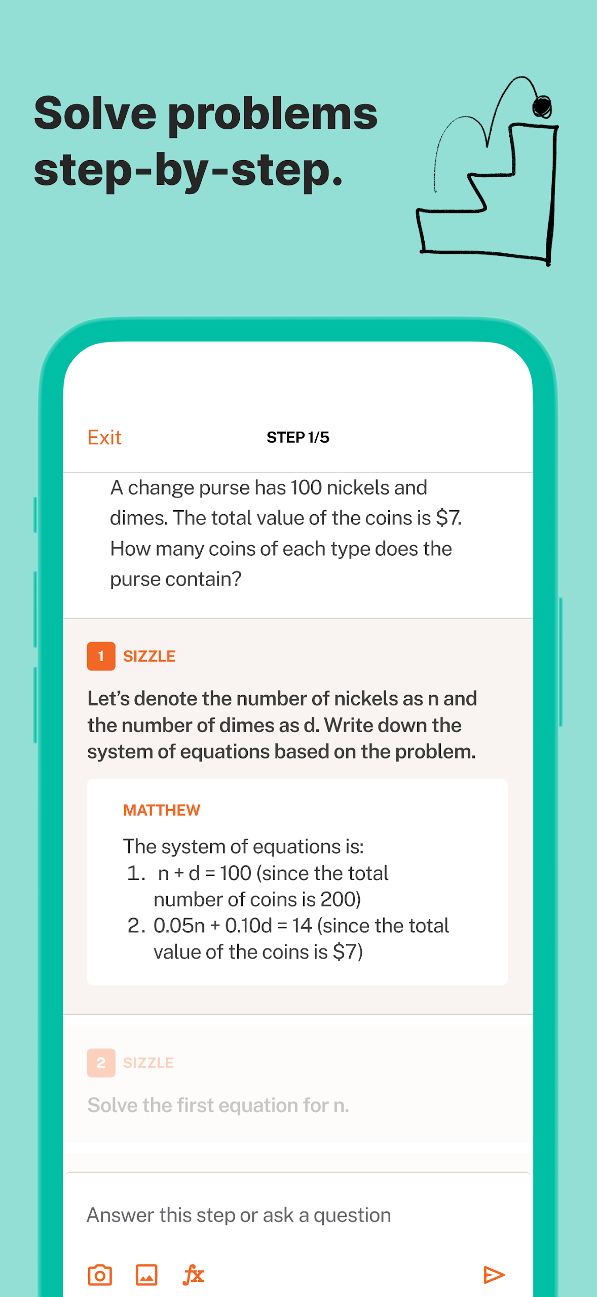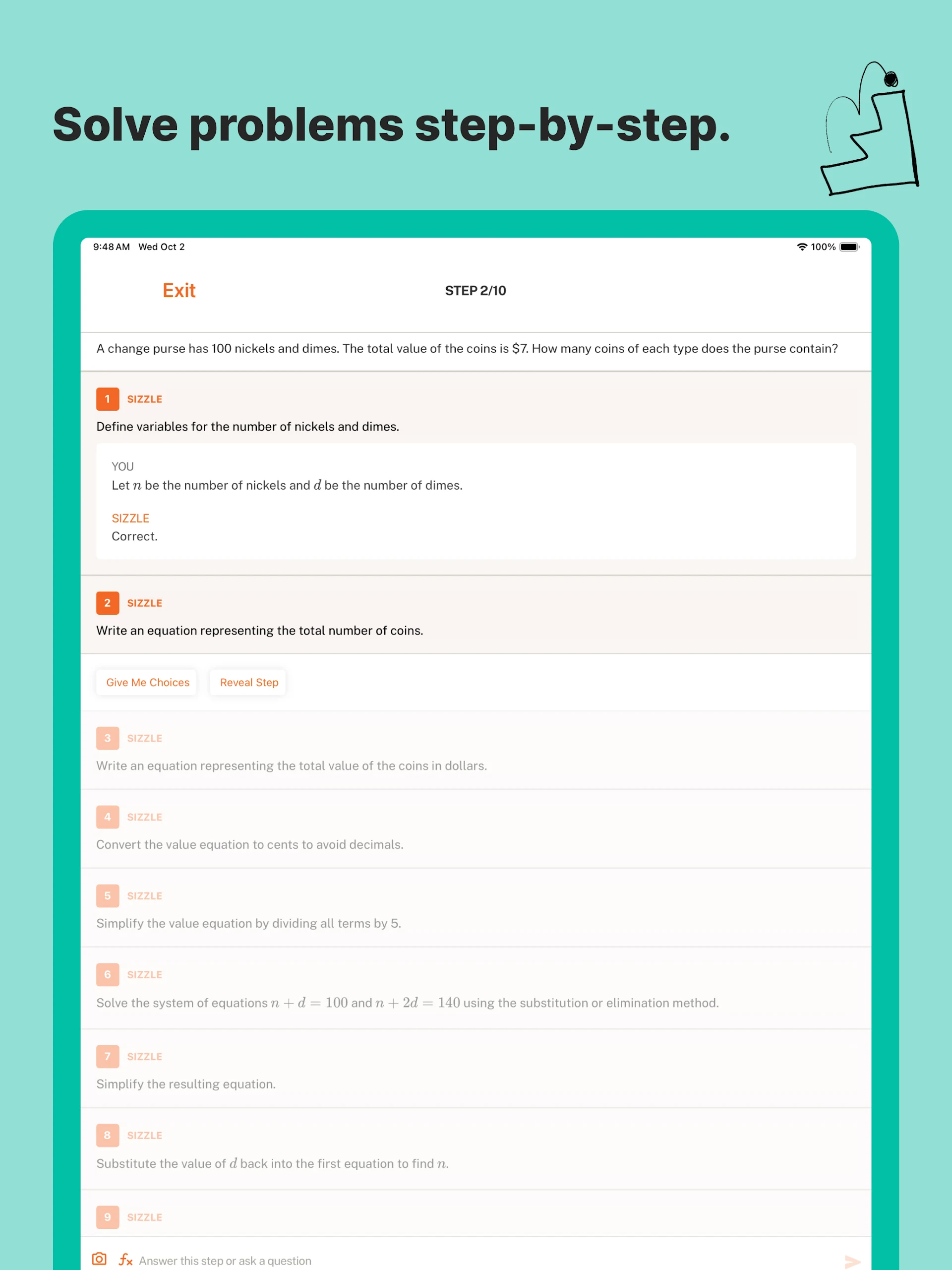 Learning with Sizzle is always interactive. Instead of passively consuming information, you tackle problems step by step, engage with different types of questions, complete quizzes, and ask for clarifications to deepen your understanding of topics.