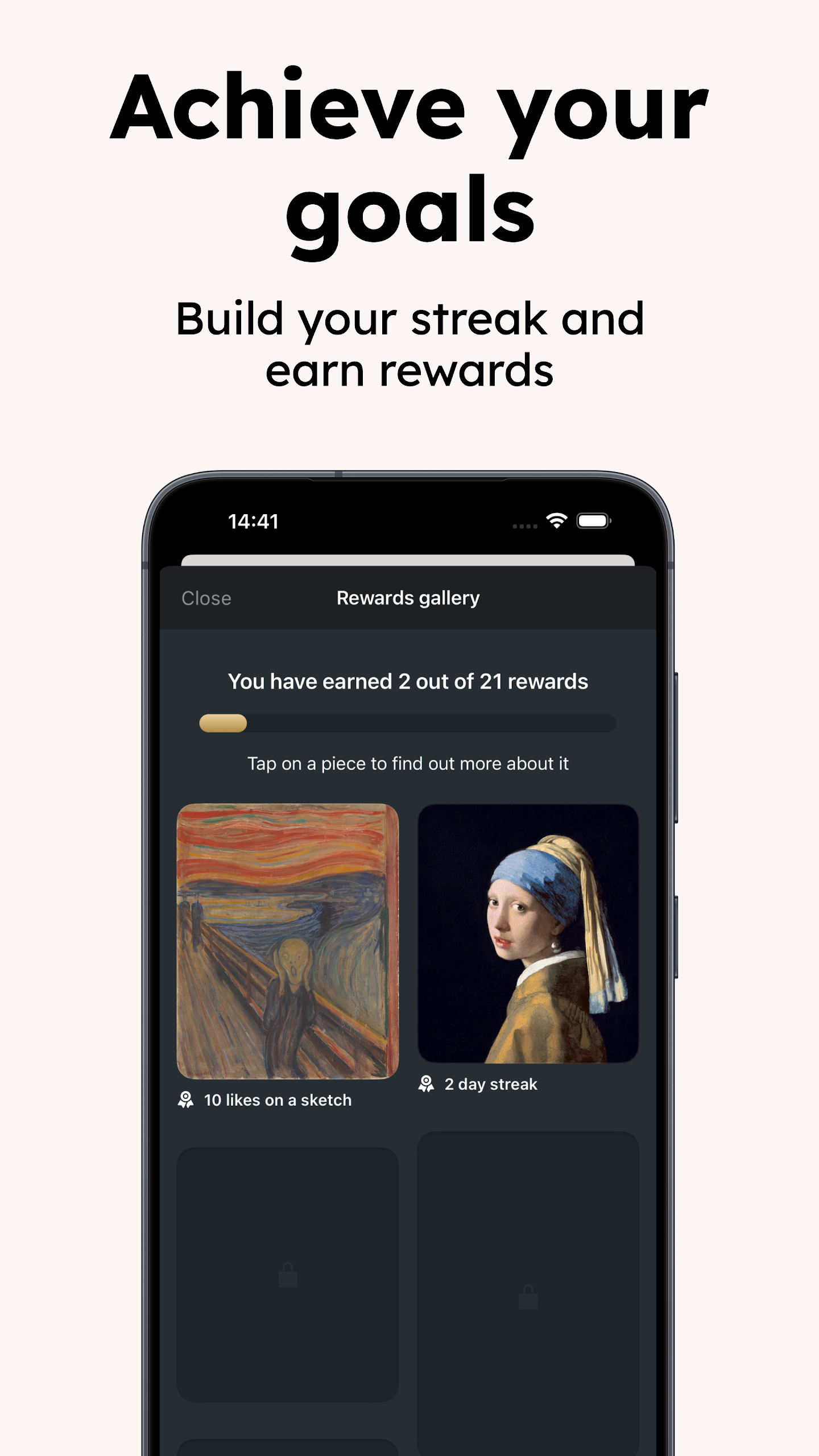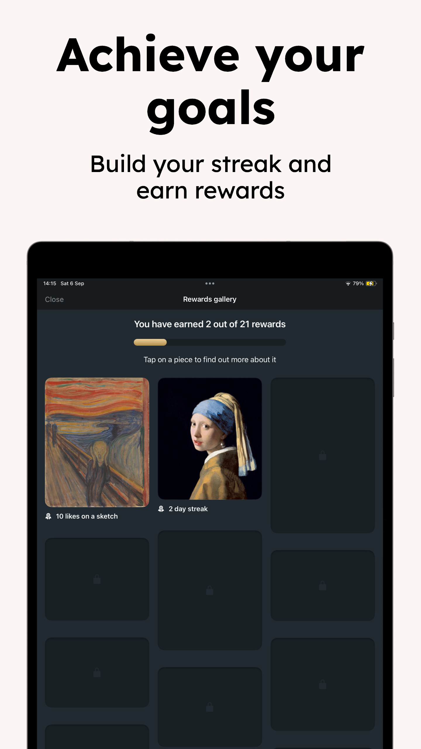When you reach certain milestones and streaks, you can add famous pieces to your own collection and learn about the artist.