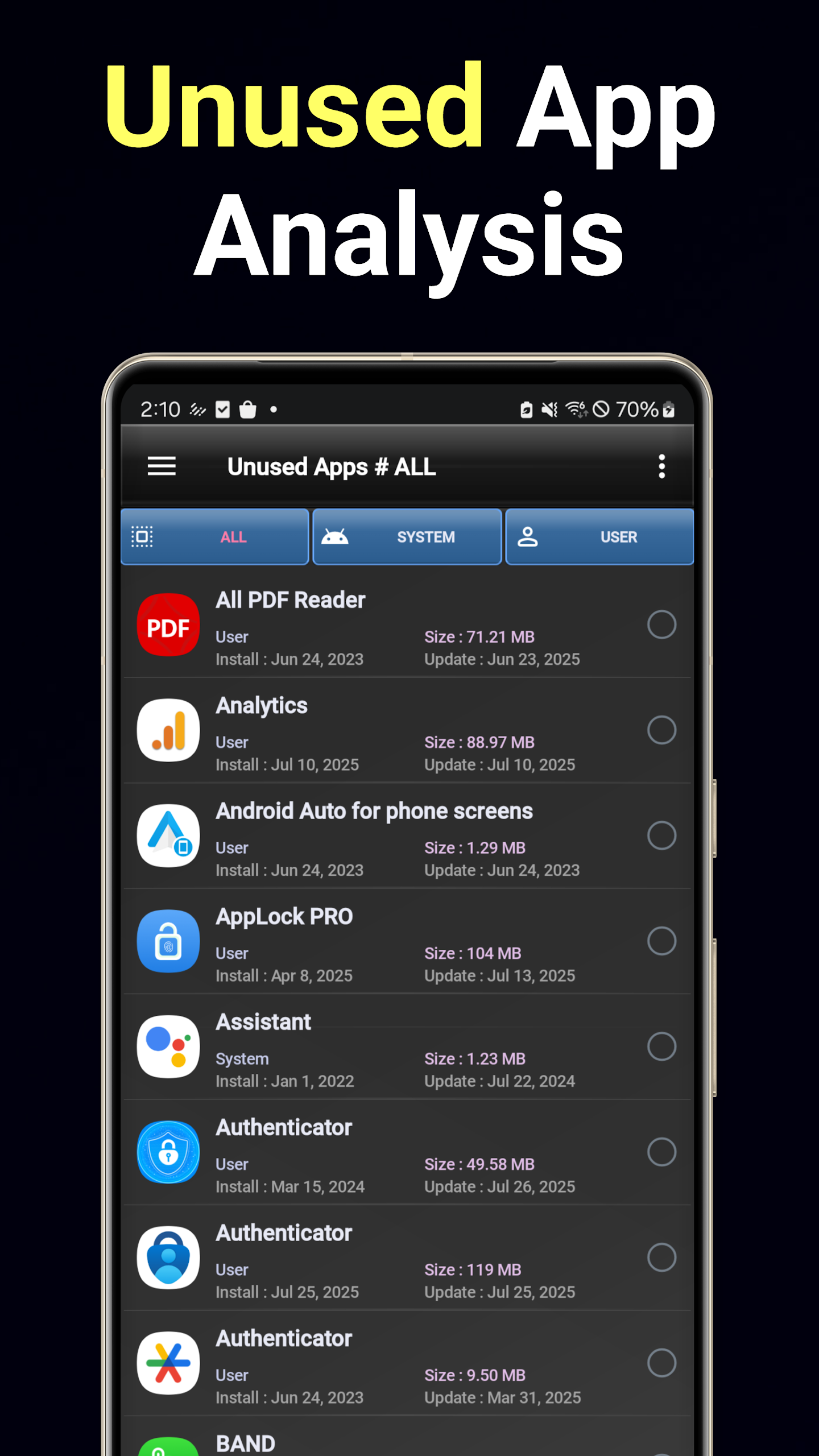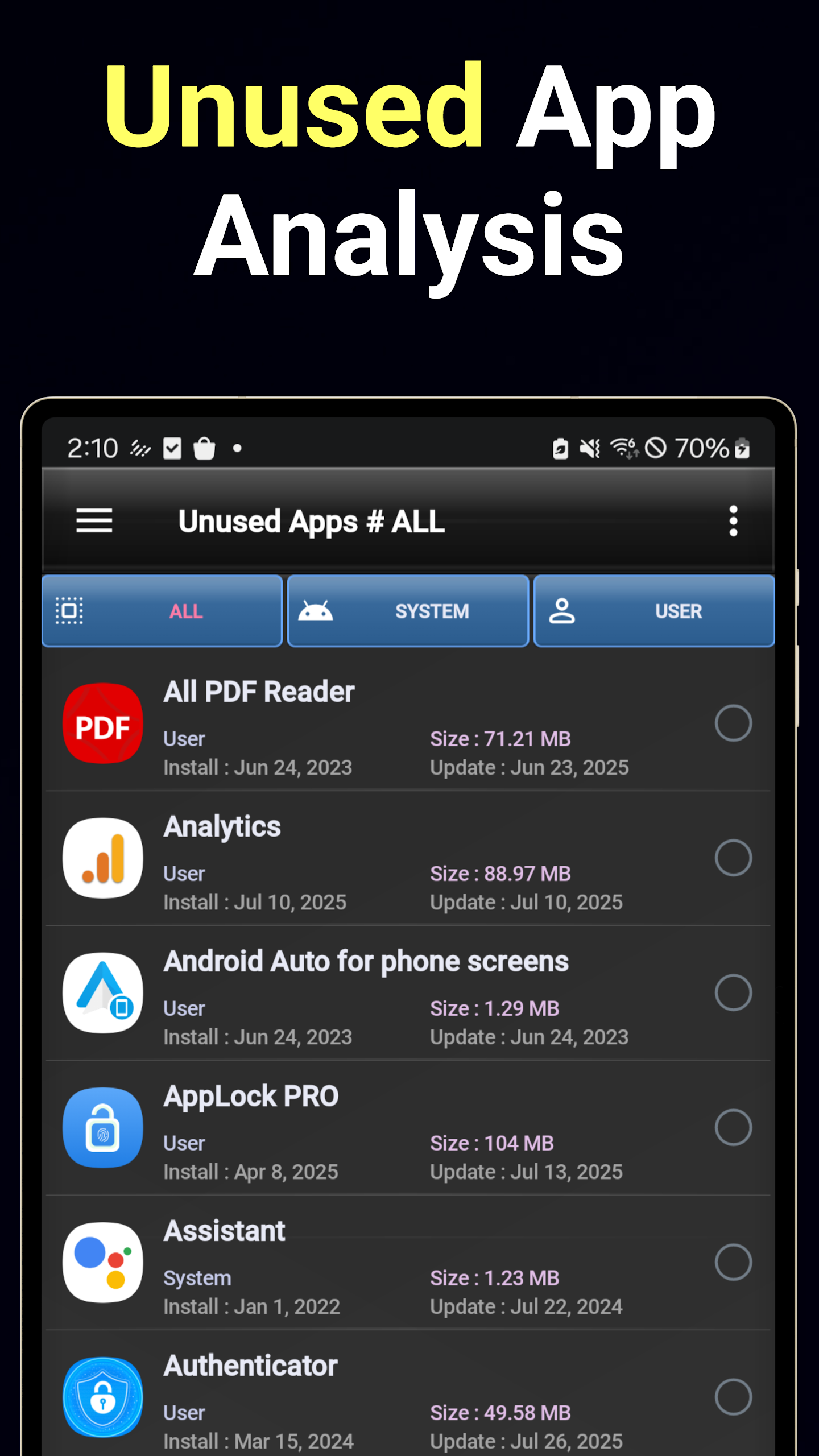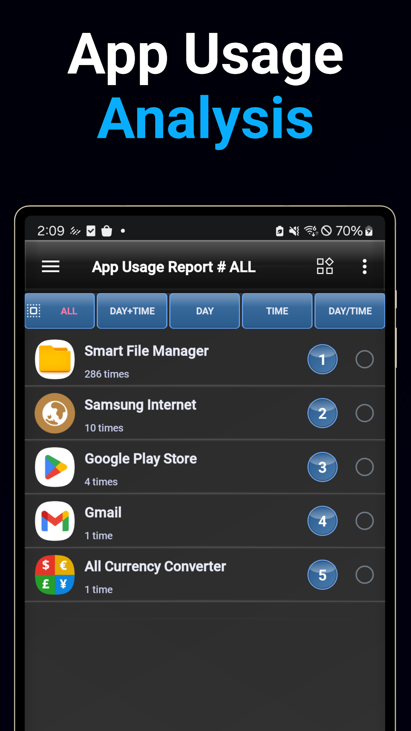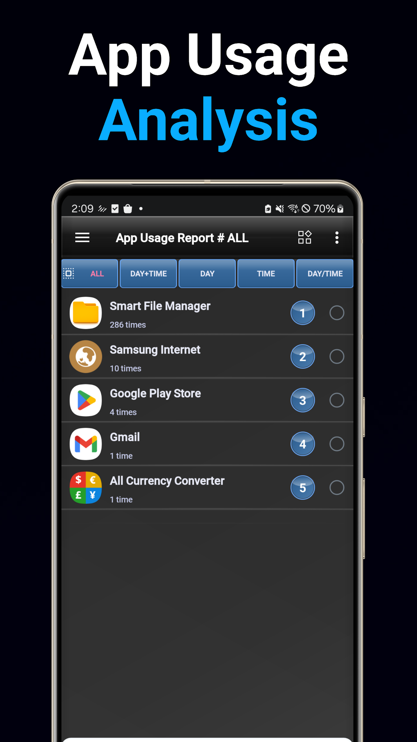 - Presents app usage metrics such as frequency, usage time, data, cache size, etc.