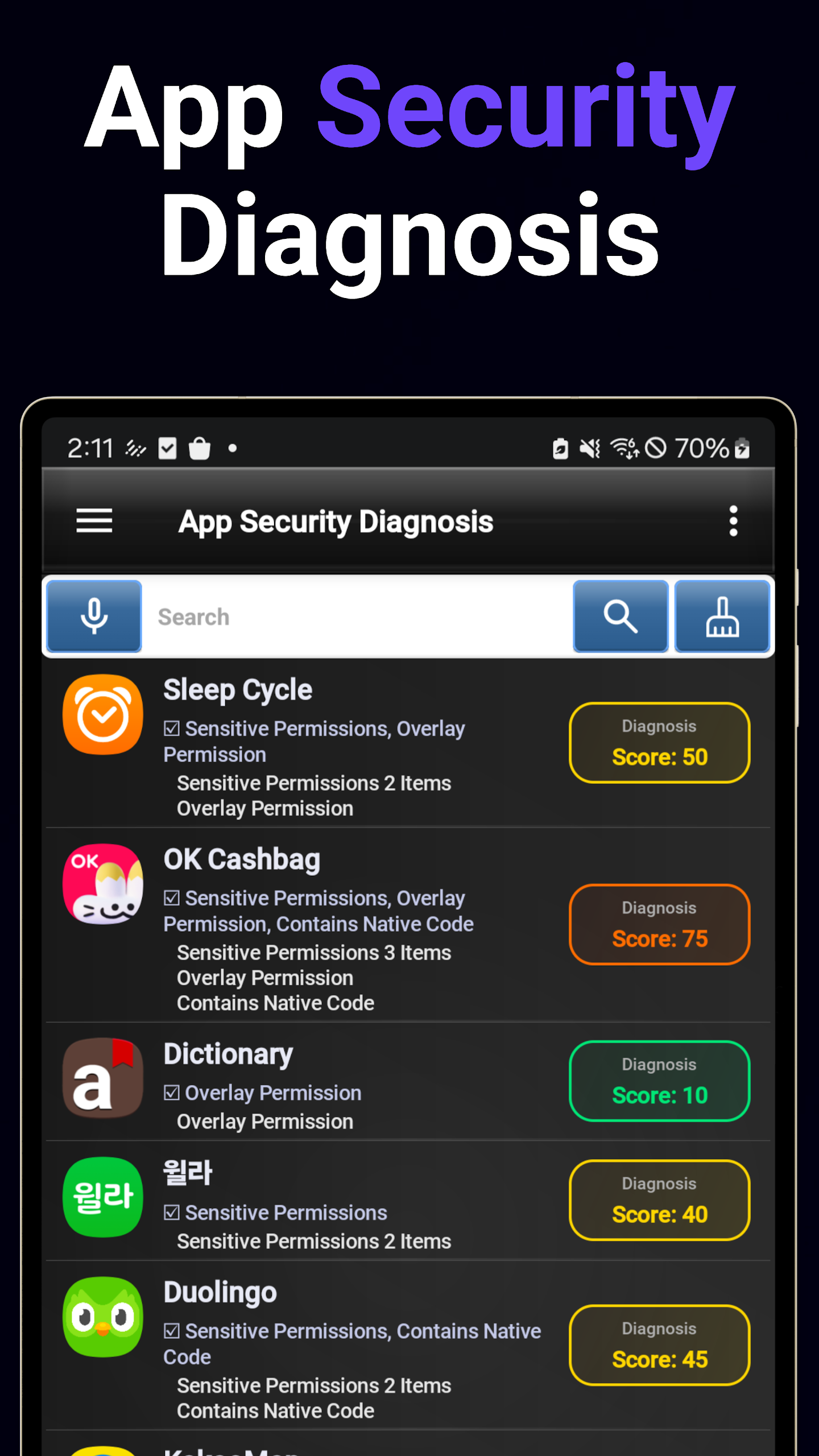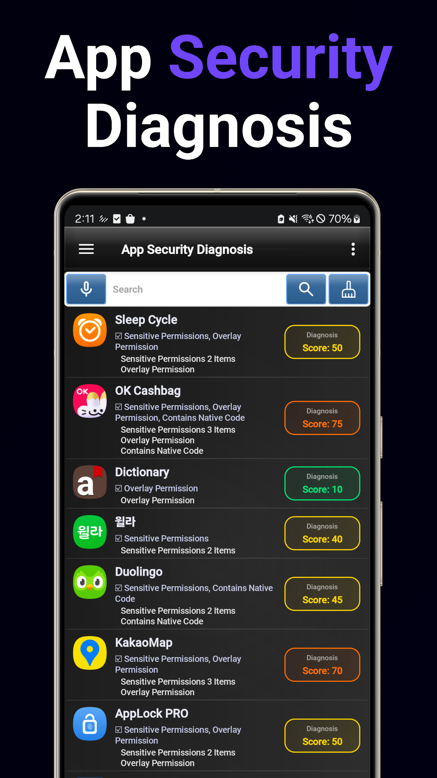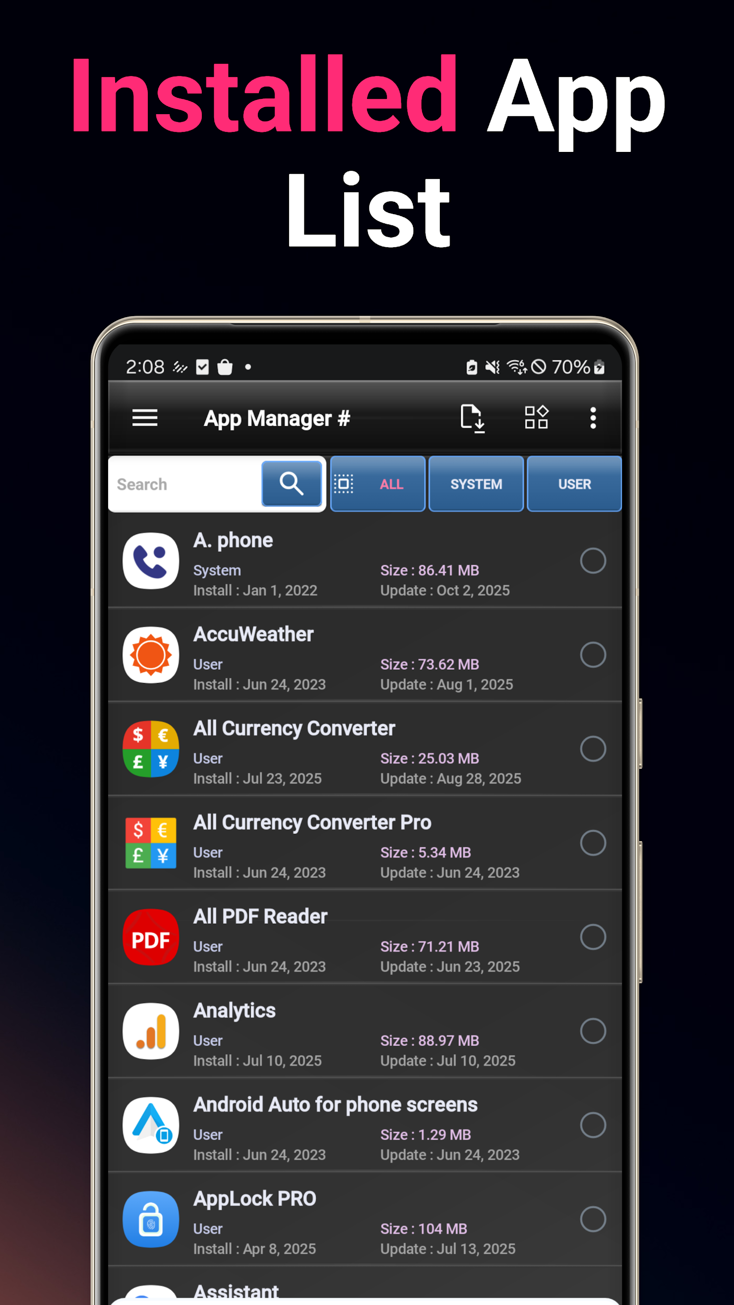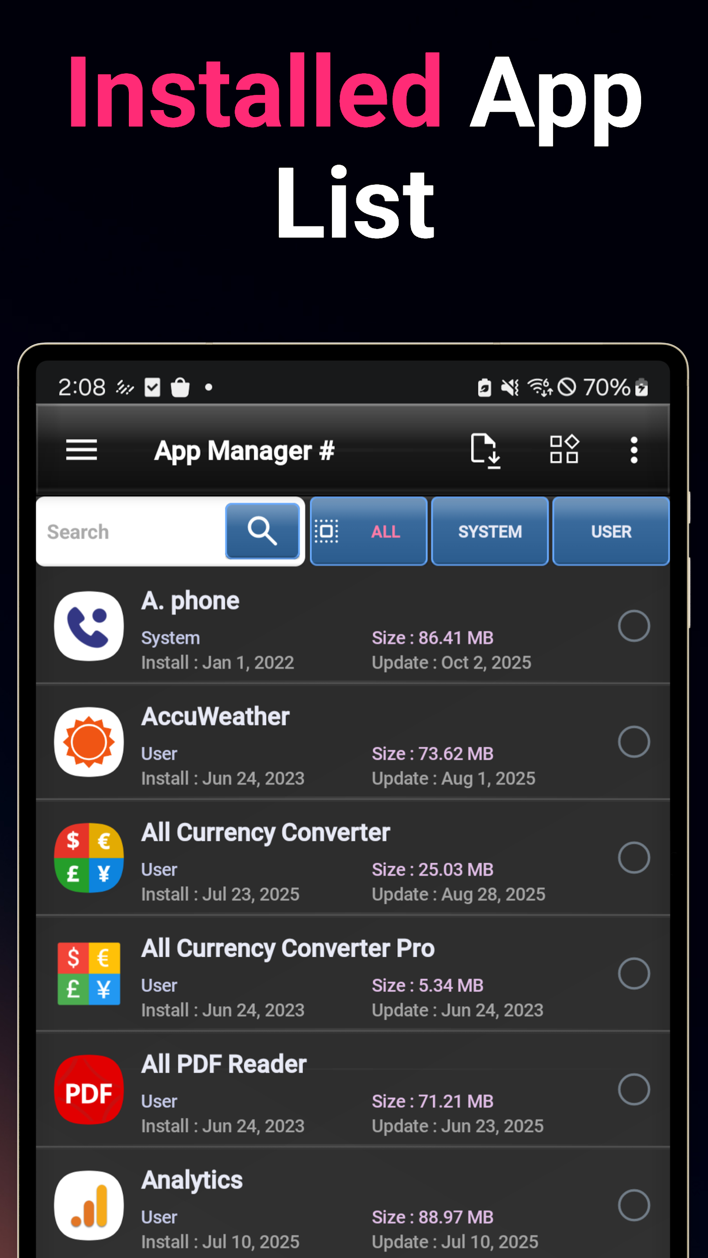 - Provides a list of installed apps (preloaded and user-installed apps are distinguished)