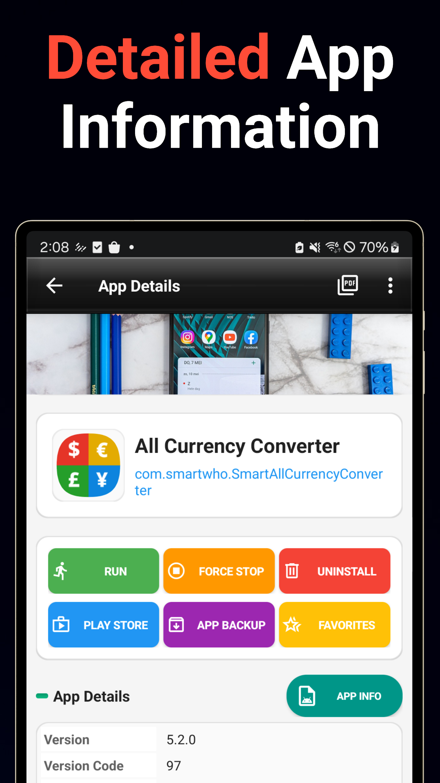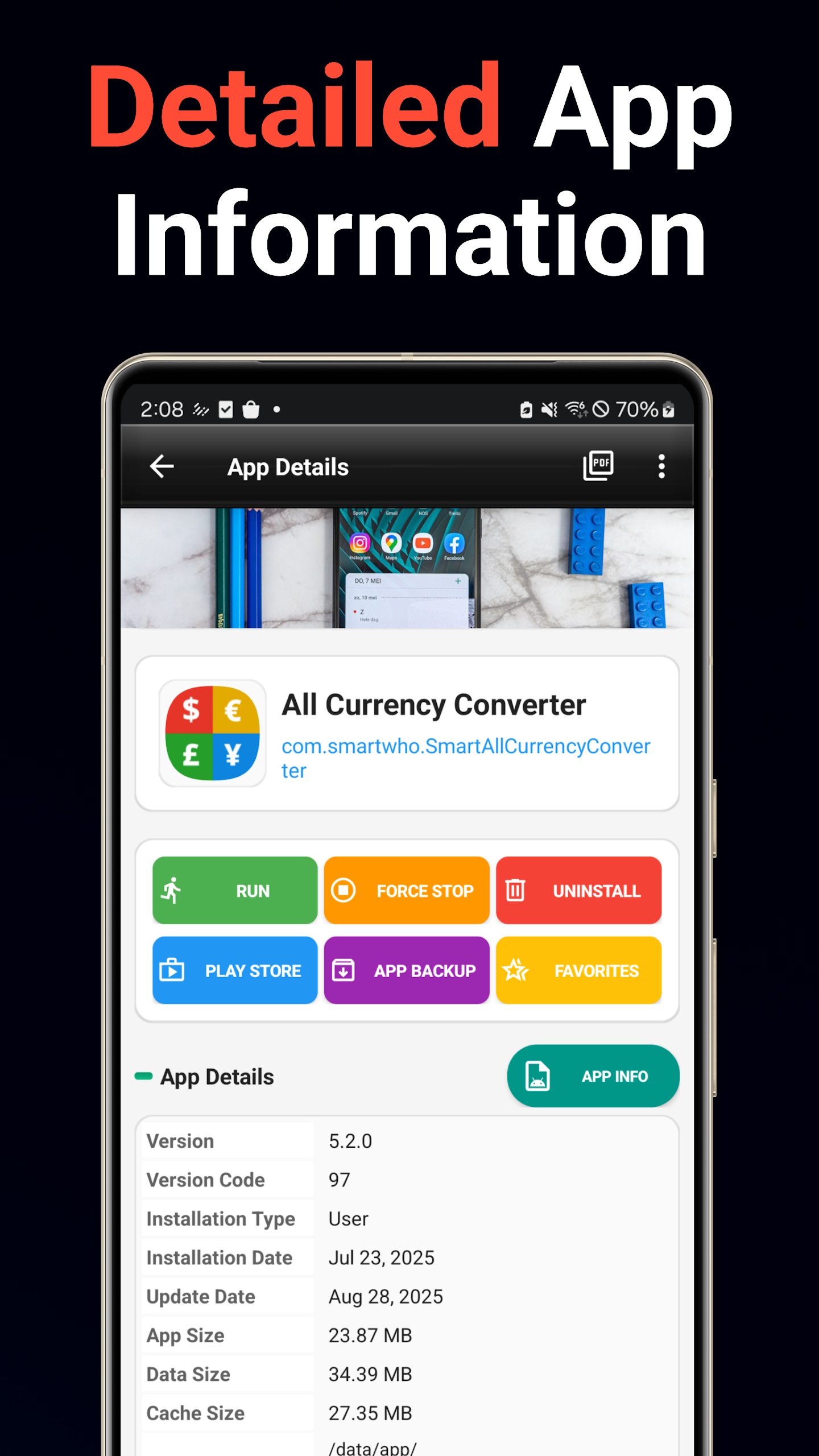 - Allows for app updates, evaluation, comments, details view, data clearing, cache clearance