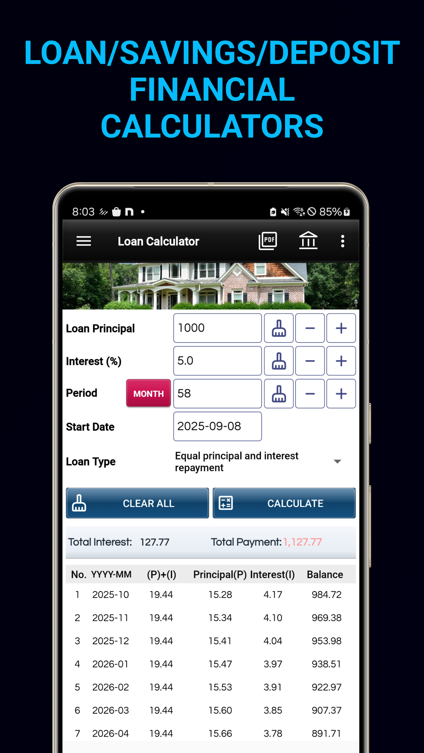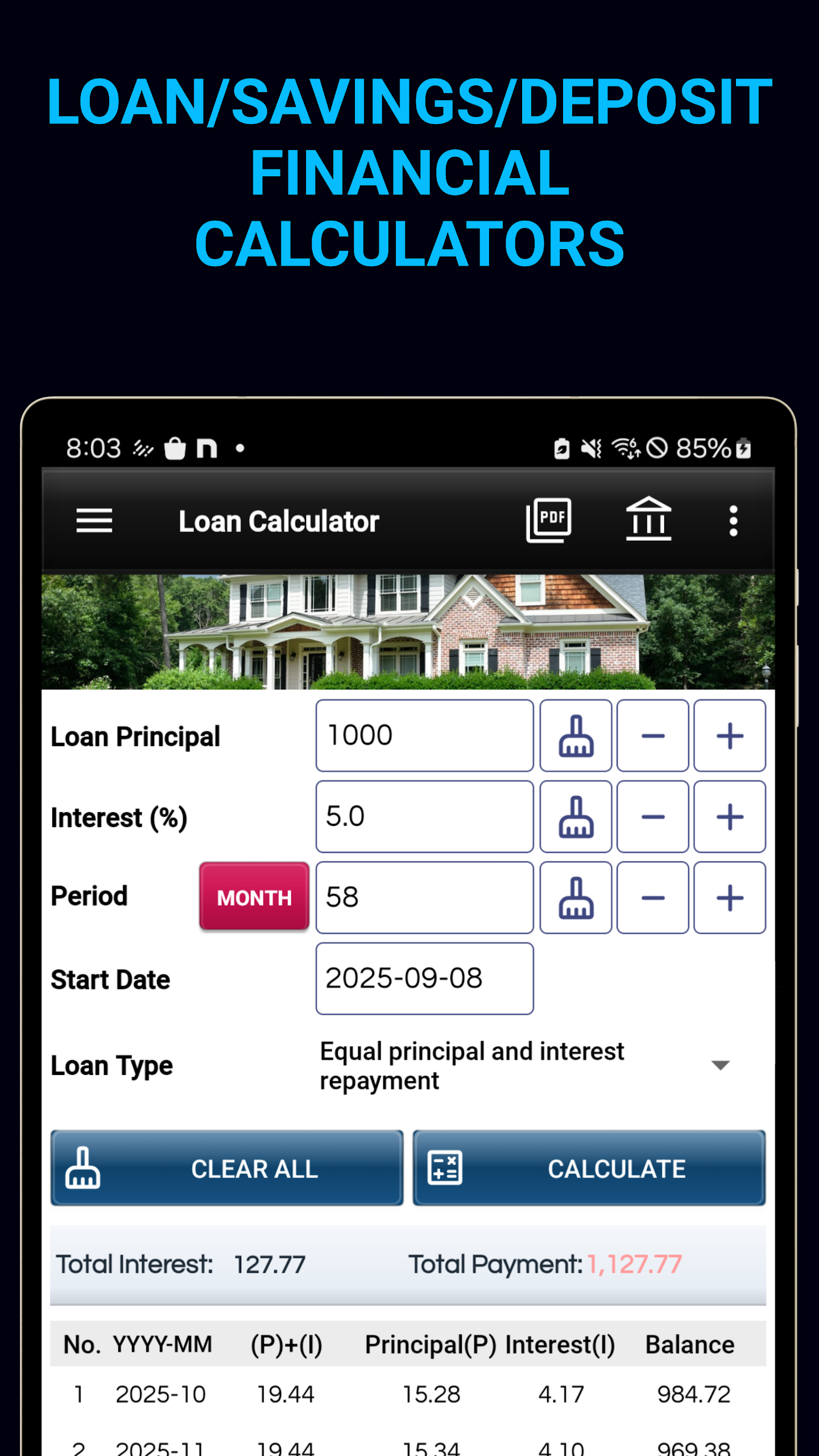 - Offers a comprehensive monthly repayment schedule based on selected loan amount, interest, duration, and type.