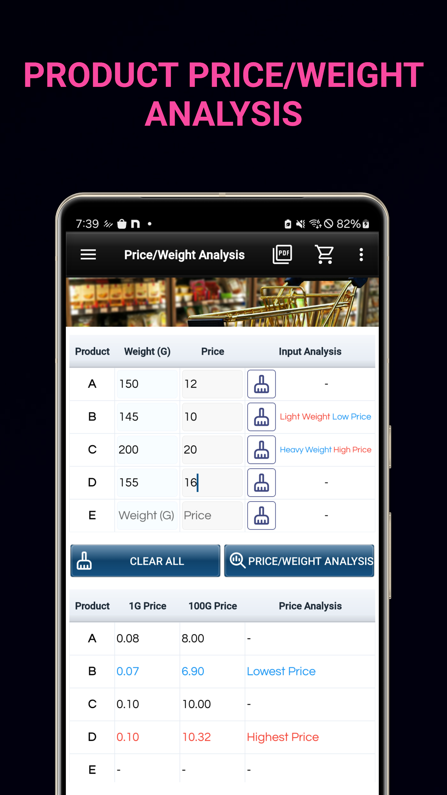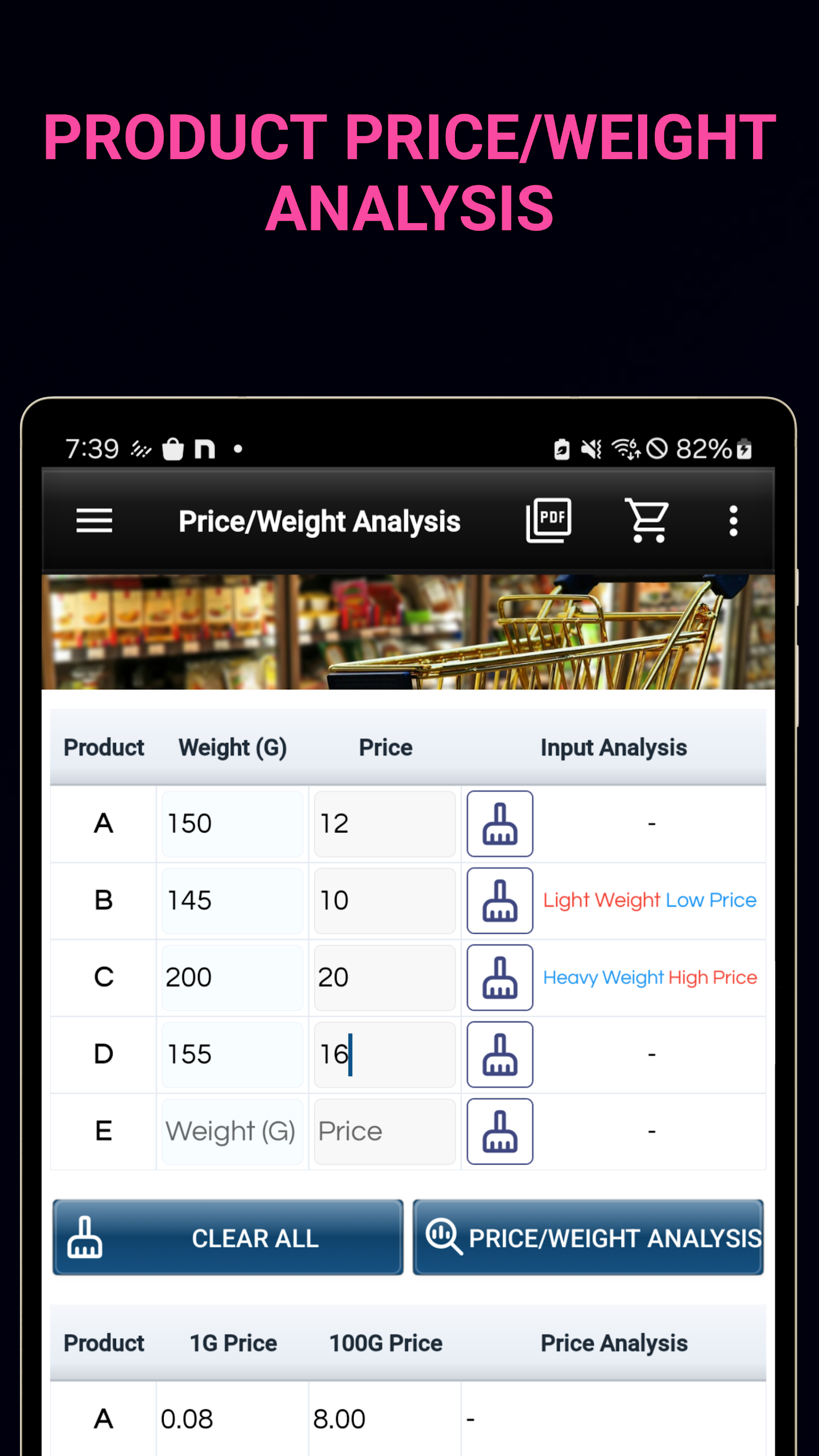 - Enter the product price and weight for automatic analysis of cost per gram and per hundred grams, enabling comparison between products for the best prices.