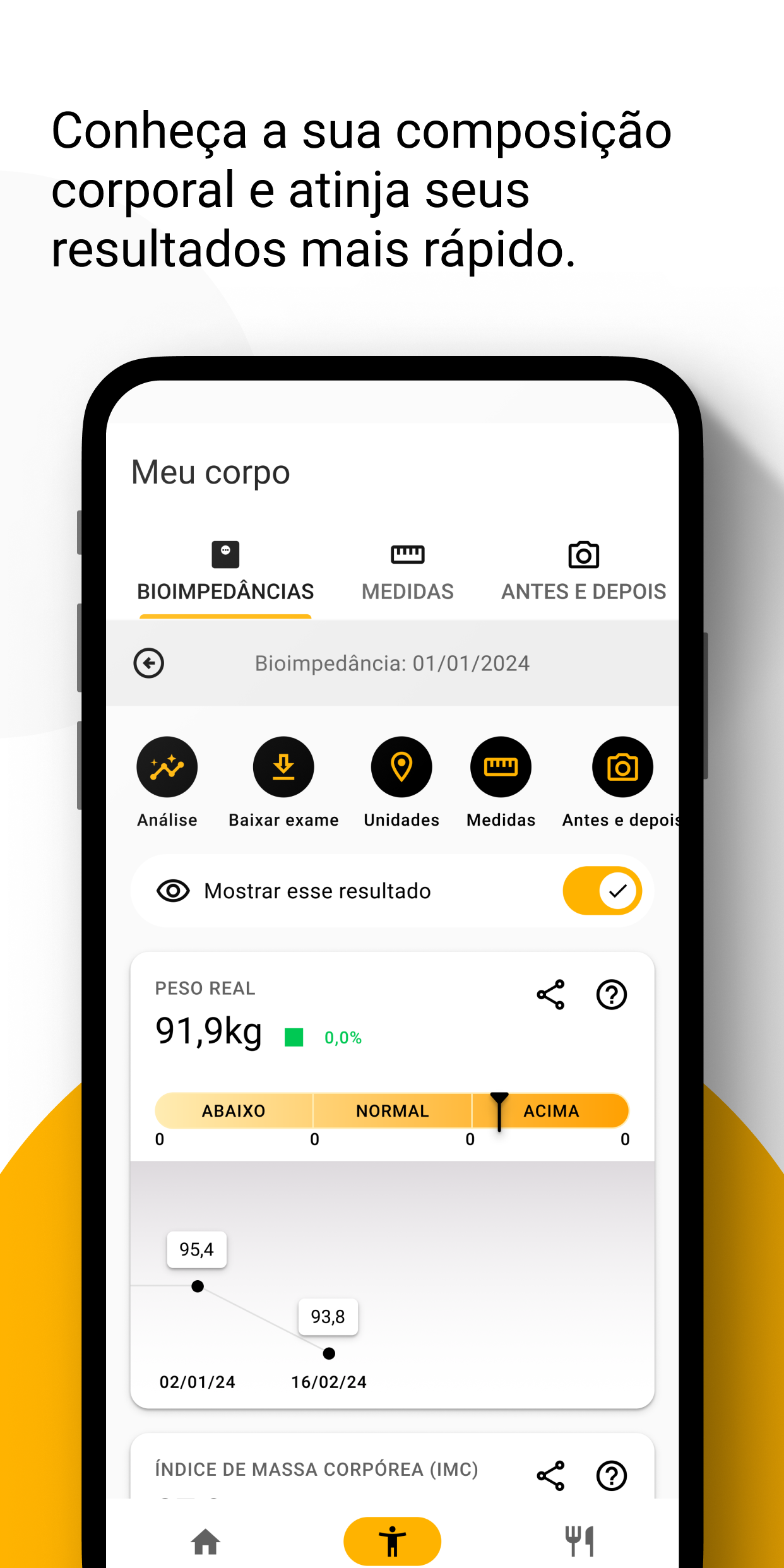 In the Smart Fit Nutri app, you can schedule appointments online, chat with the nutritionist, record your body measurements and follow your progress graphs. For more detailed monitoring, it is possible to purchase bioimpedances separately by subscribing to Smart Fit Body, which comes with 12 bioimpedances or separately.