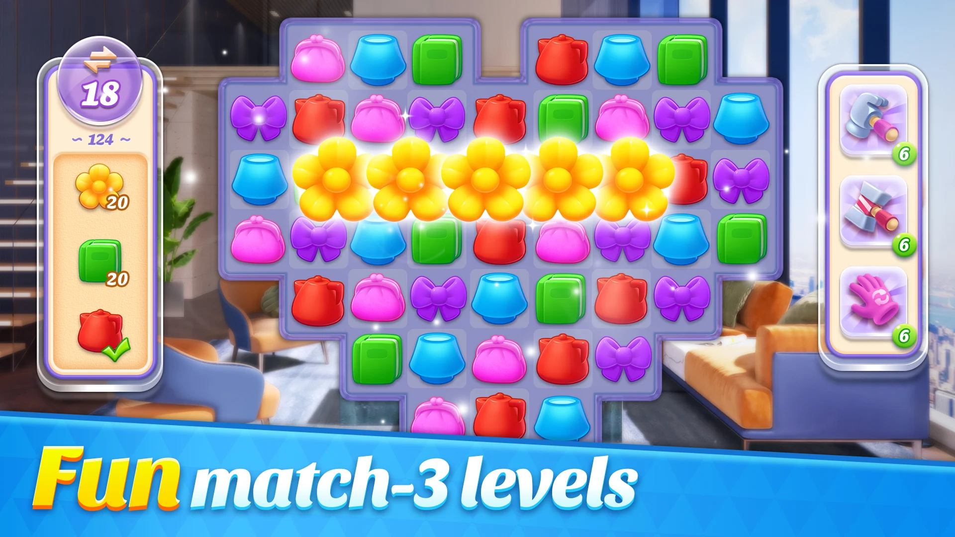 In this game, the mansion designs closely resemble reality, incorporating various styles of furniture. To find more inspiration, you can solve match-3 puzzles. And believe me, the match-3 gameplay is just as thrilling as the construction part!