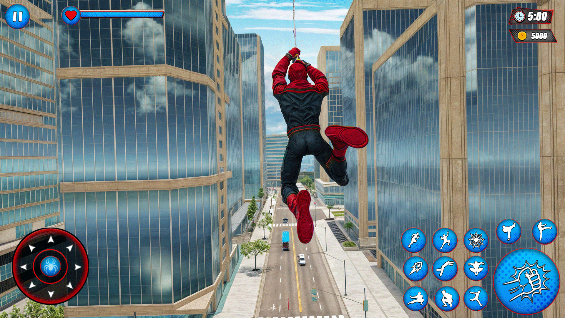 ◦ A: The controls are designed to be smooth and user-friendly. A virtual joystick usually handles movement, while on-screen buttons are used for actions like attacking, jumping, and deploying the super rope to swing or fly.