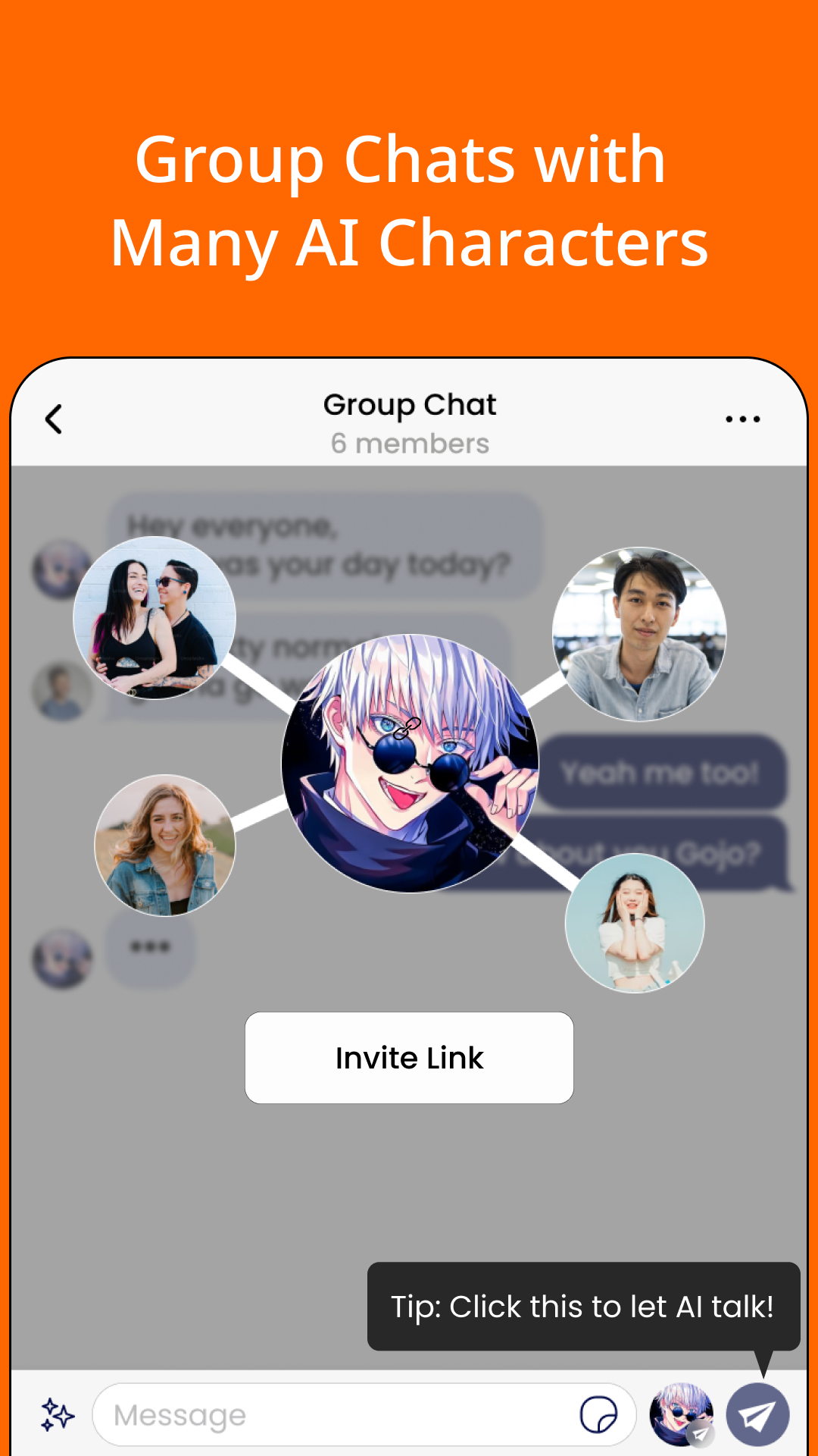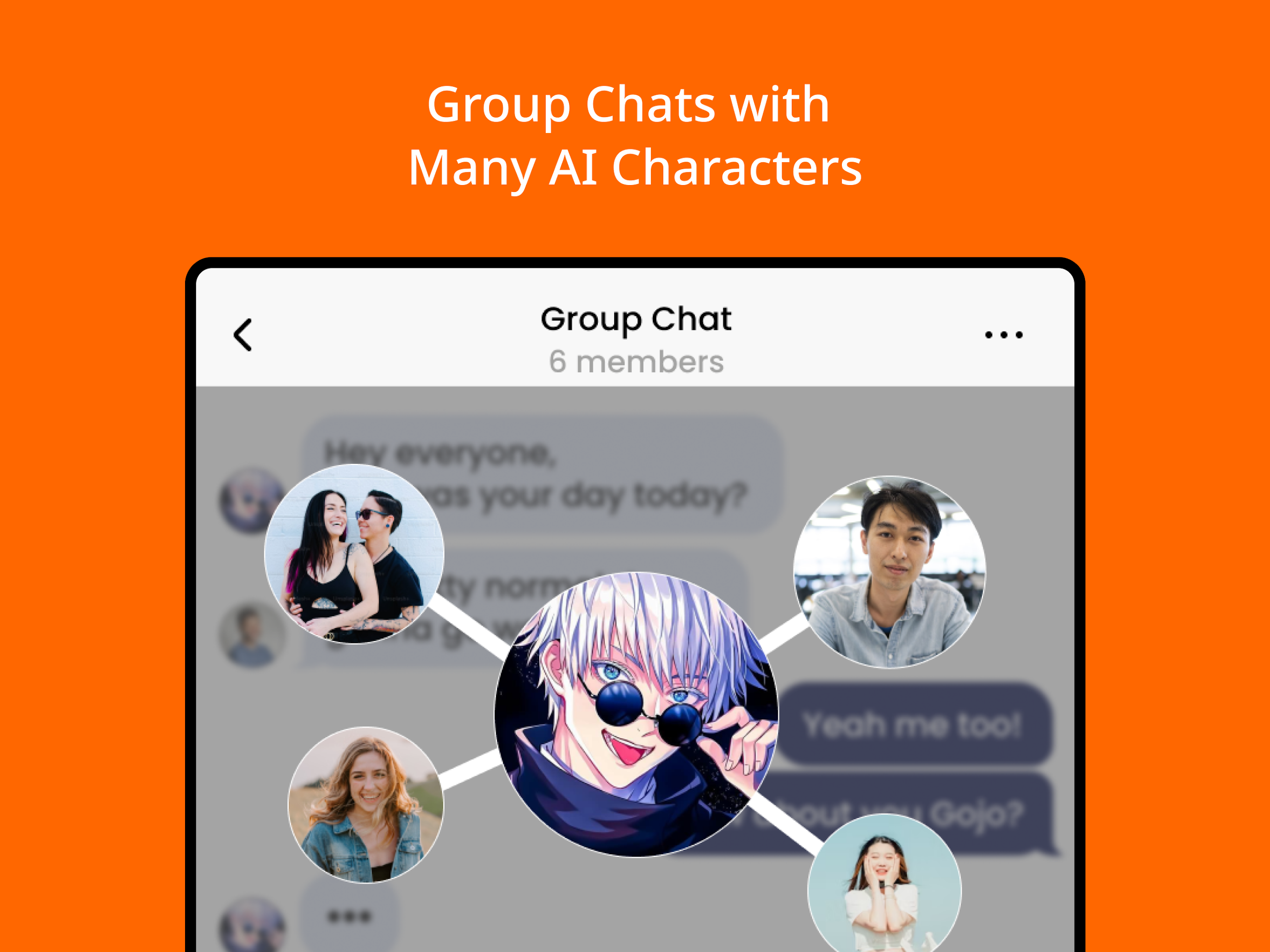 • Group Chats: Initiate a group chat with friends and introduce an AI character for enhanced and engaging discussions.