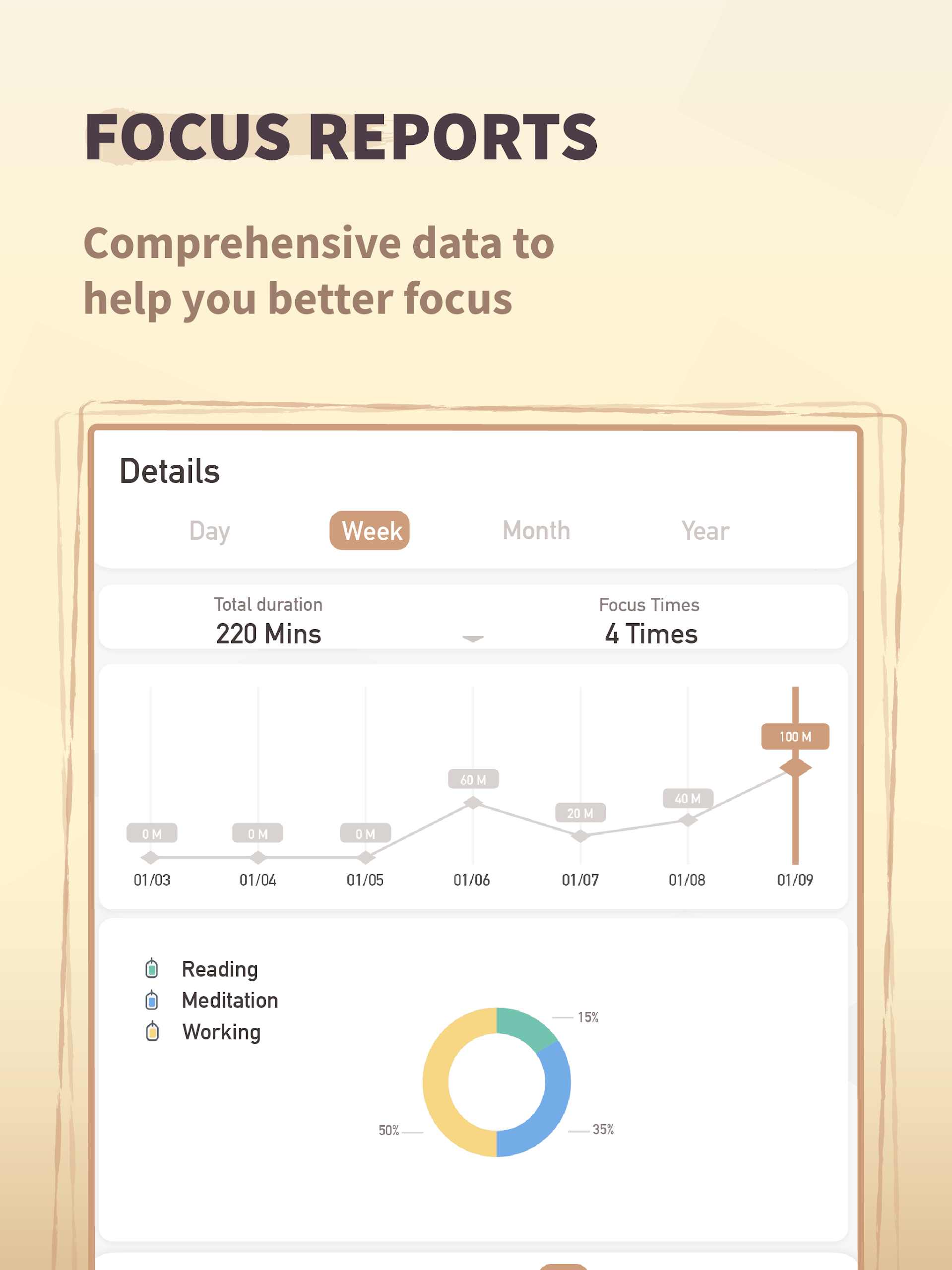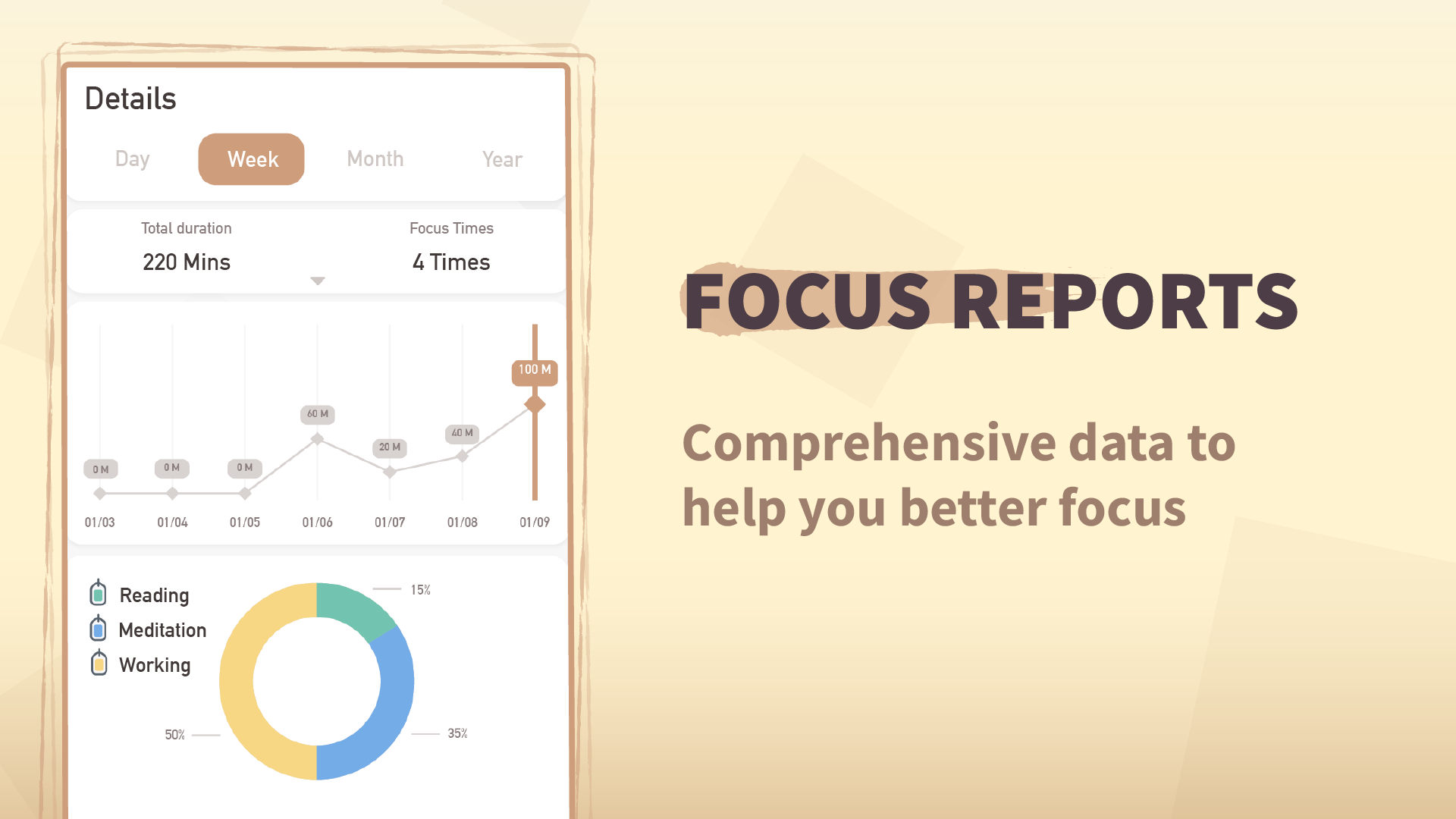 * Progress tracking - Visual representations like pie charts and line graphs to monitor focused time, helping you strategize your to-do list and improve both productivity and concentration.