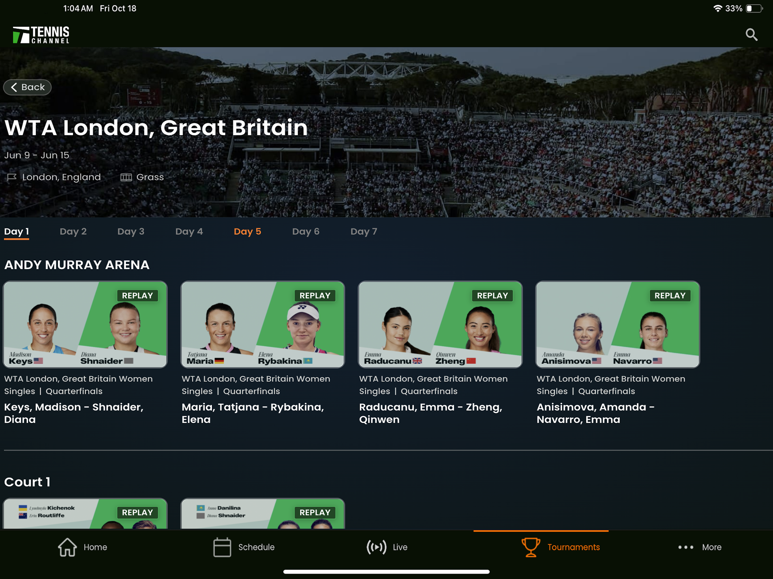 Live matches from main and outer courts