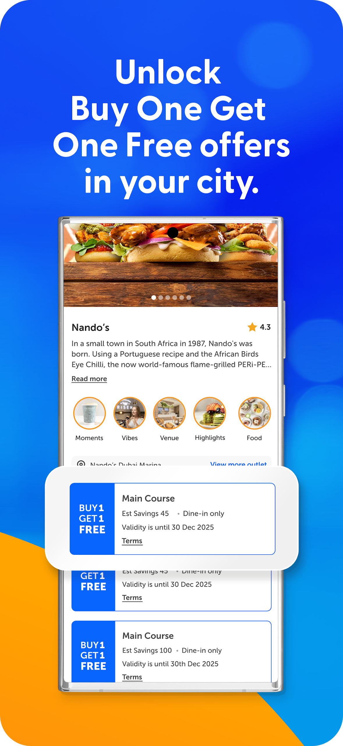 Explore a realm of incredible discounts with the ENTERTAINER. Say goodbye to full-price payments and enjoy buy one get one free deals at top restaurants, bars, attractions, leisure activities, spas, salons, retail outlets, services, hotel accommodations, and much more throughout your city.