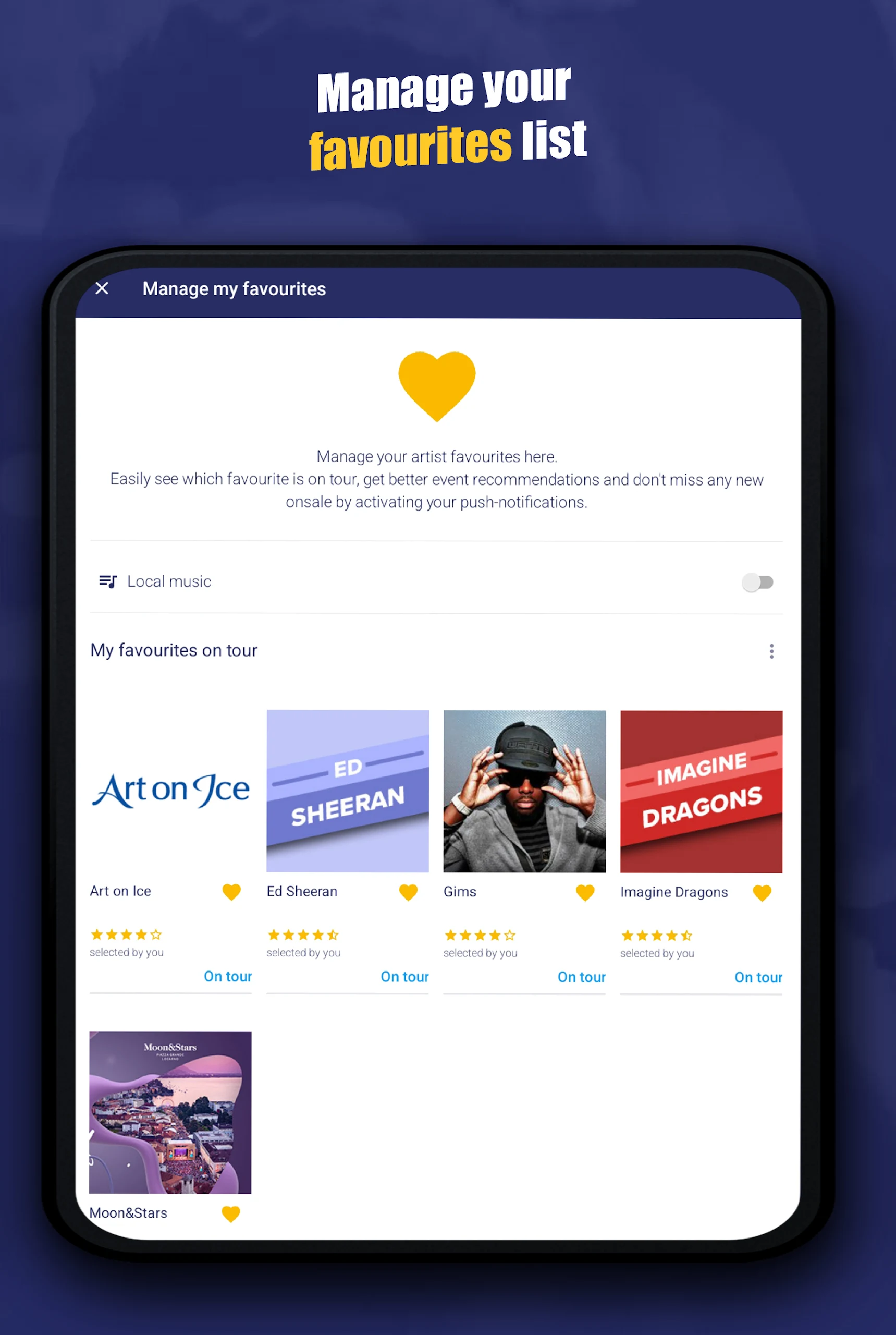 • Favourite artists: Designate your preferred artists by clicking the heart icon or import them from your local music library.