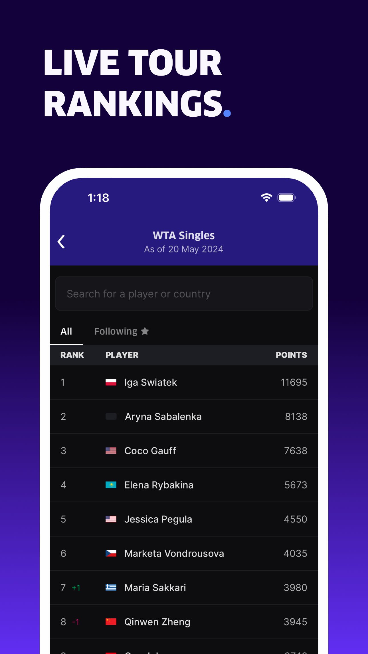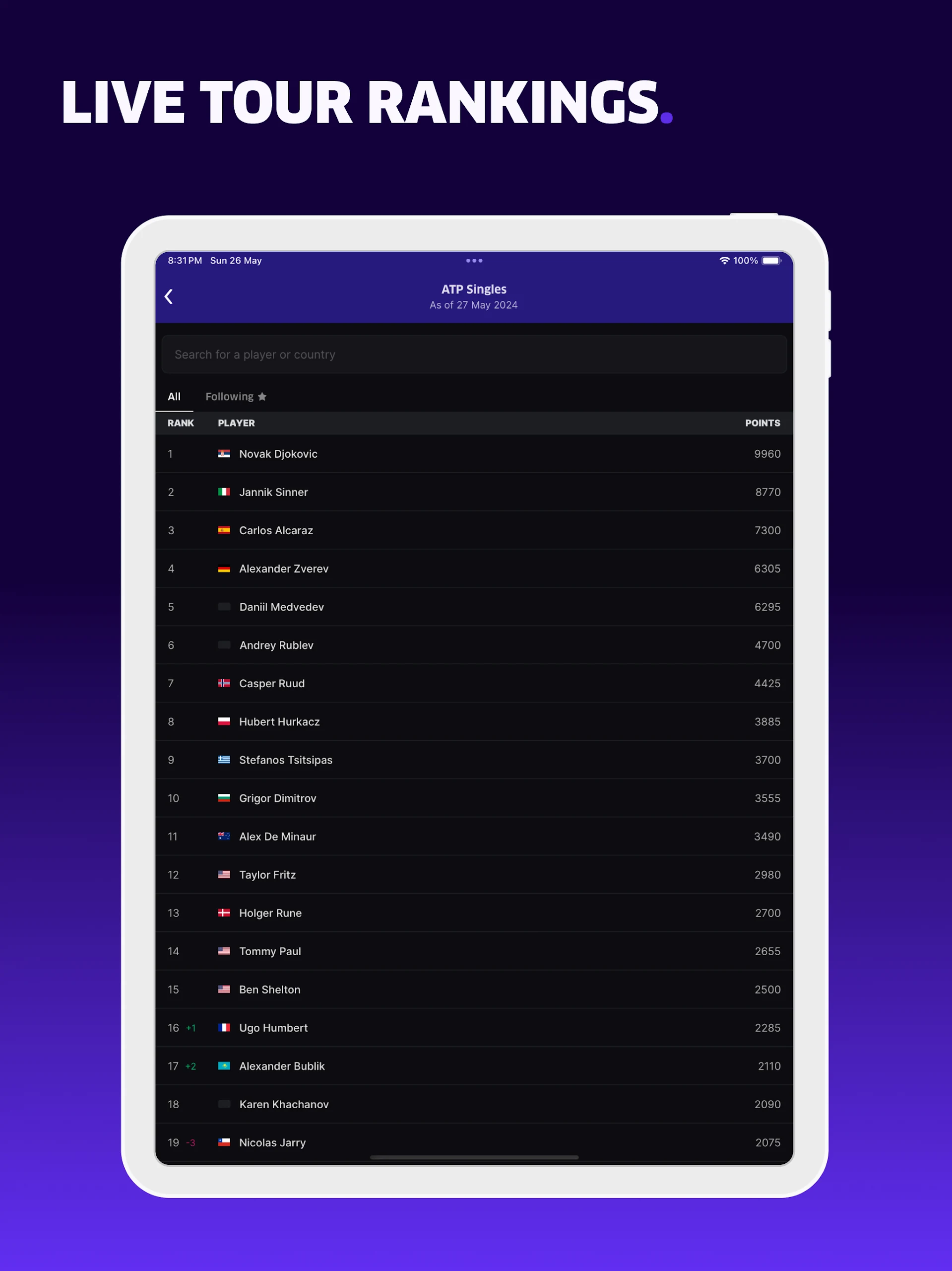 Check the latest Official ATP and WTA rankings at the beginning of each week, including the ATP Race and WTA Race, while tracking live rankings throughout the week.