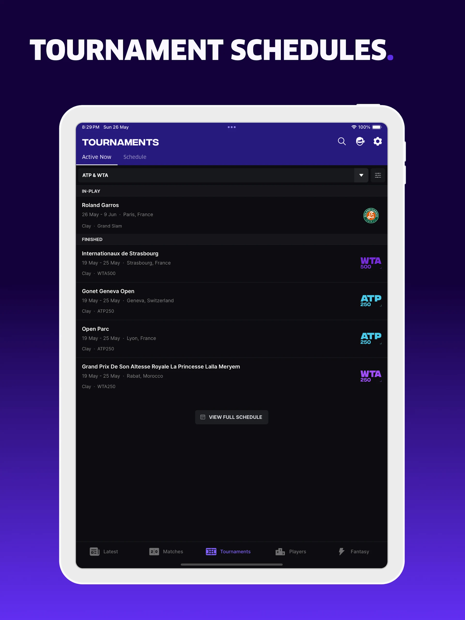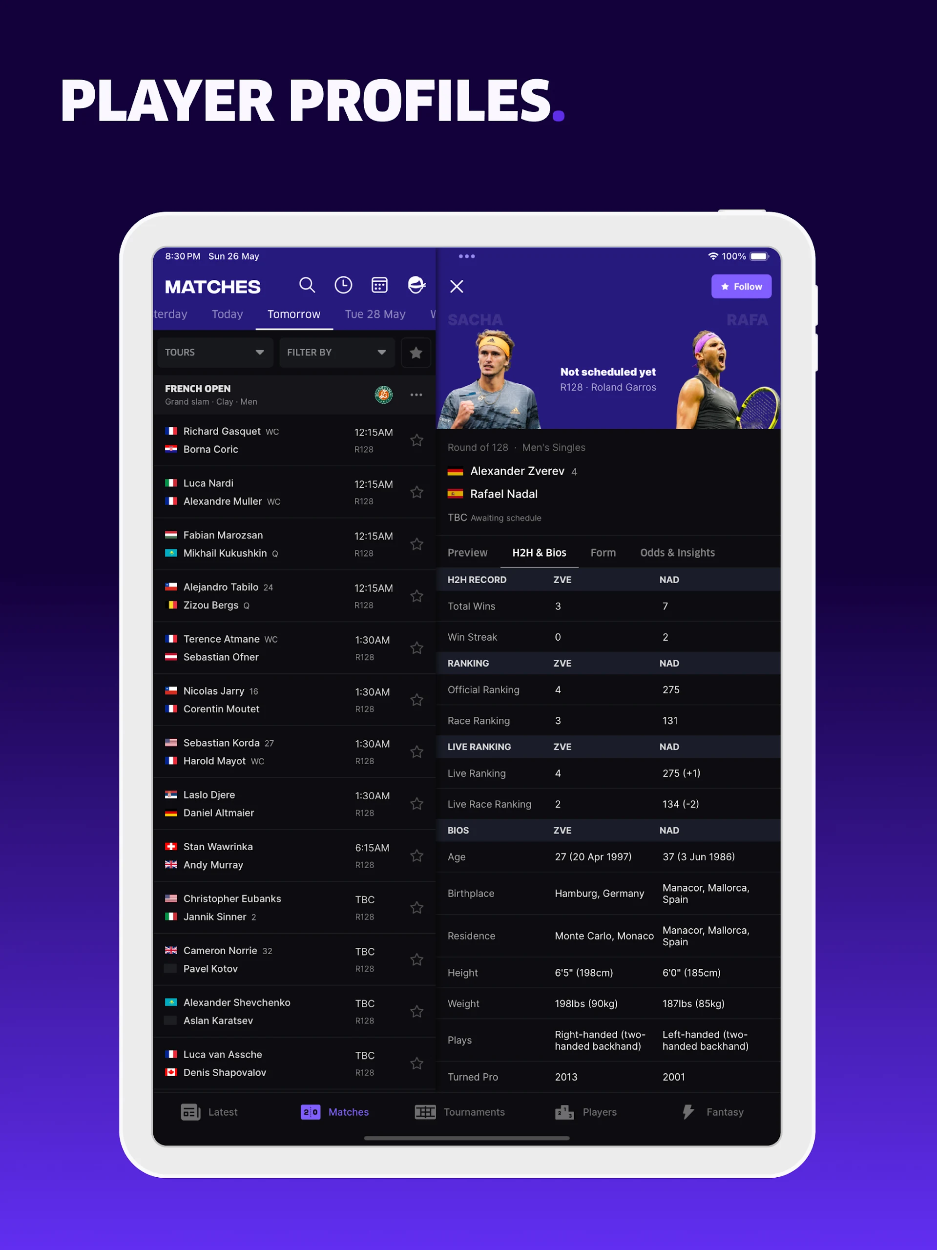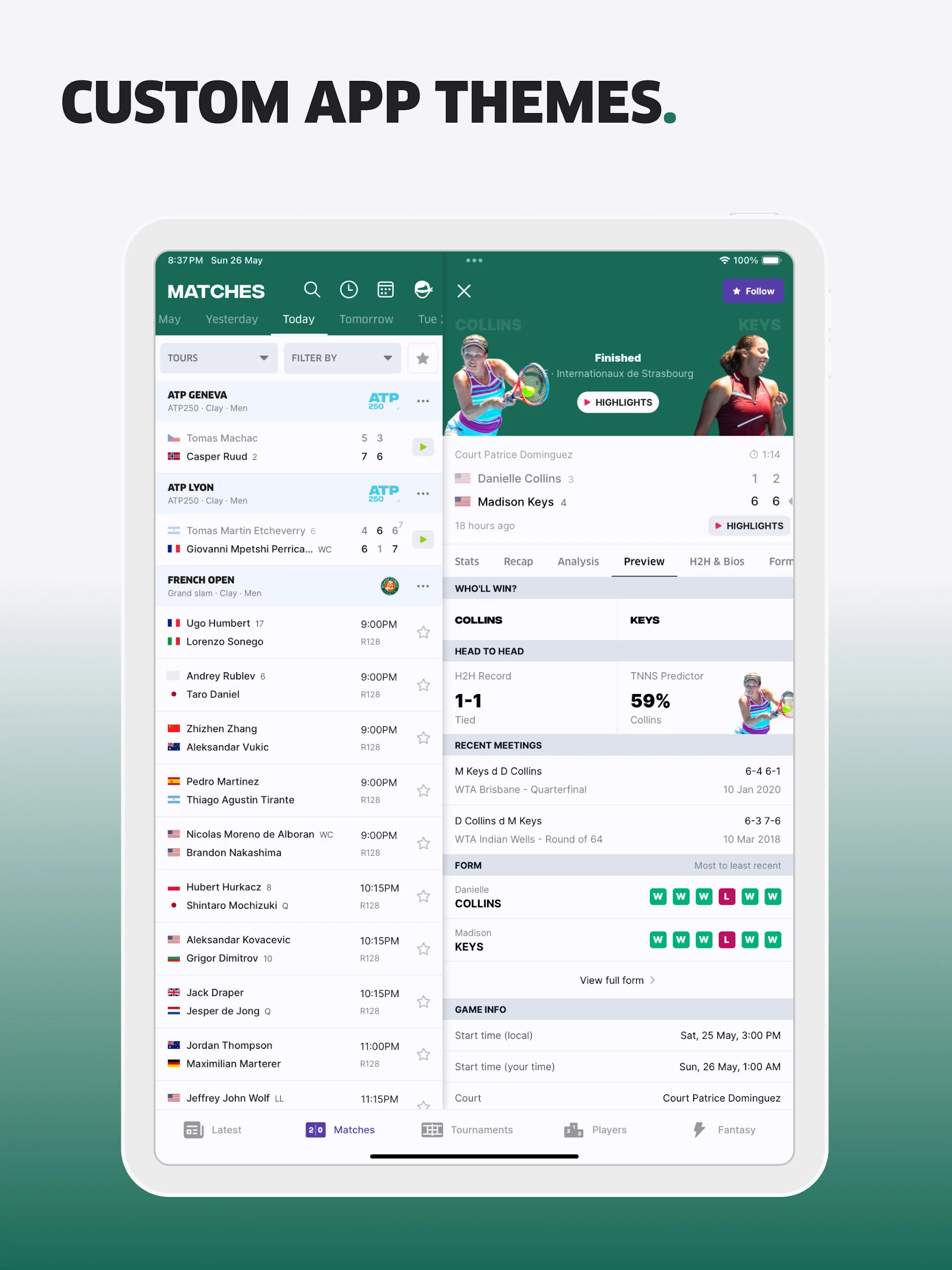 If you're a fan of players like Roger Federer or Rafael Nadal, or have a preference for either ATP or WTA tennis, customize your experience by selecting your favorite players and matches to receive relevant scores, news, and schedules.