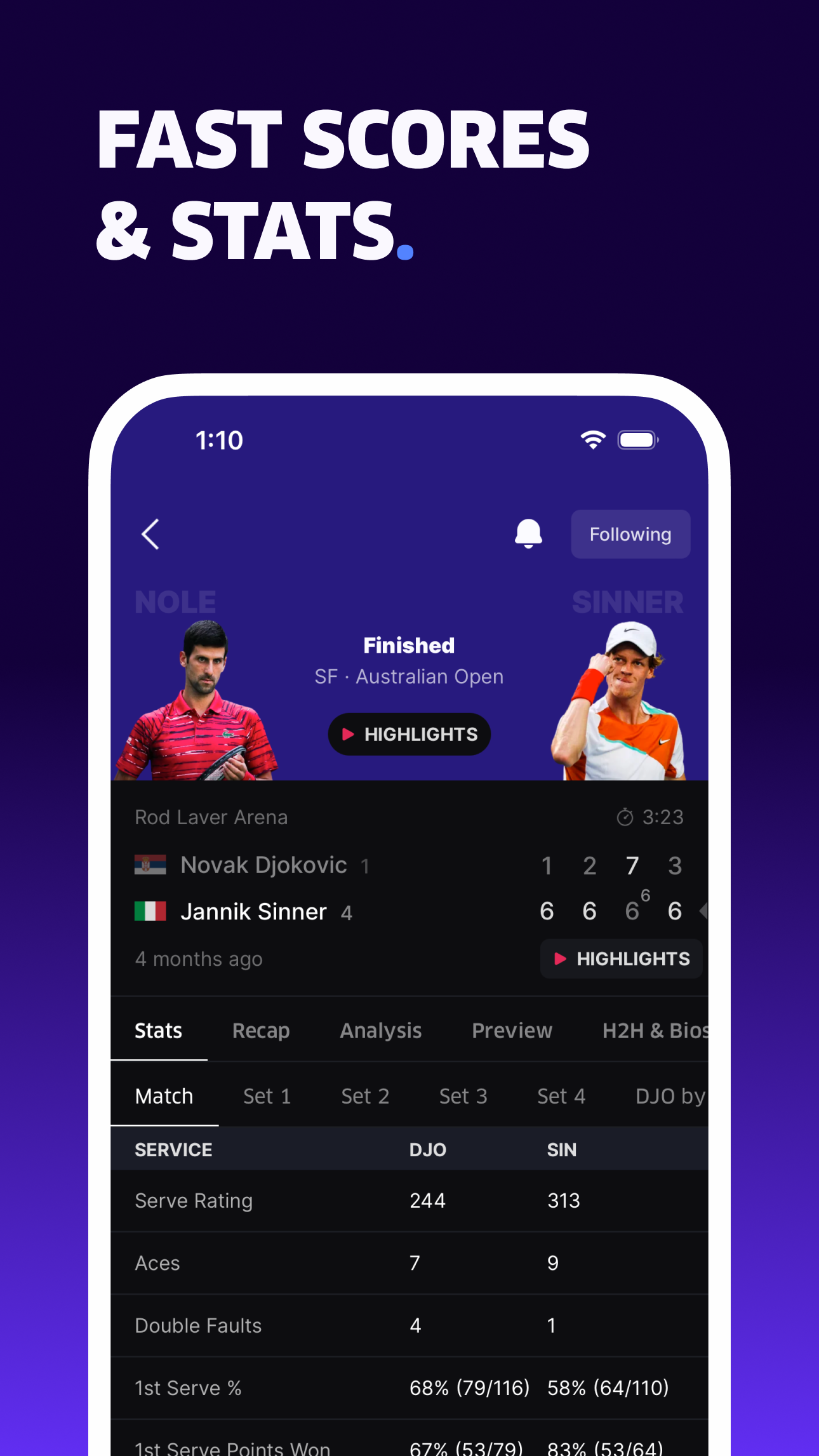 TNNS serves as your essential app for keeping track of live tennis scores, results, rankings, news, videos, statistics, streams, and schedules for professional tennis events, including Grand Slams, ATP Tennis, WTA Tennis, ATP Challenger Tour, ITF Tour, and more.