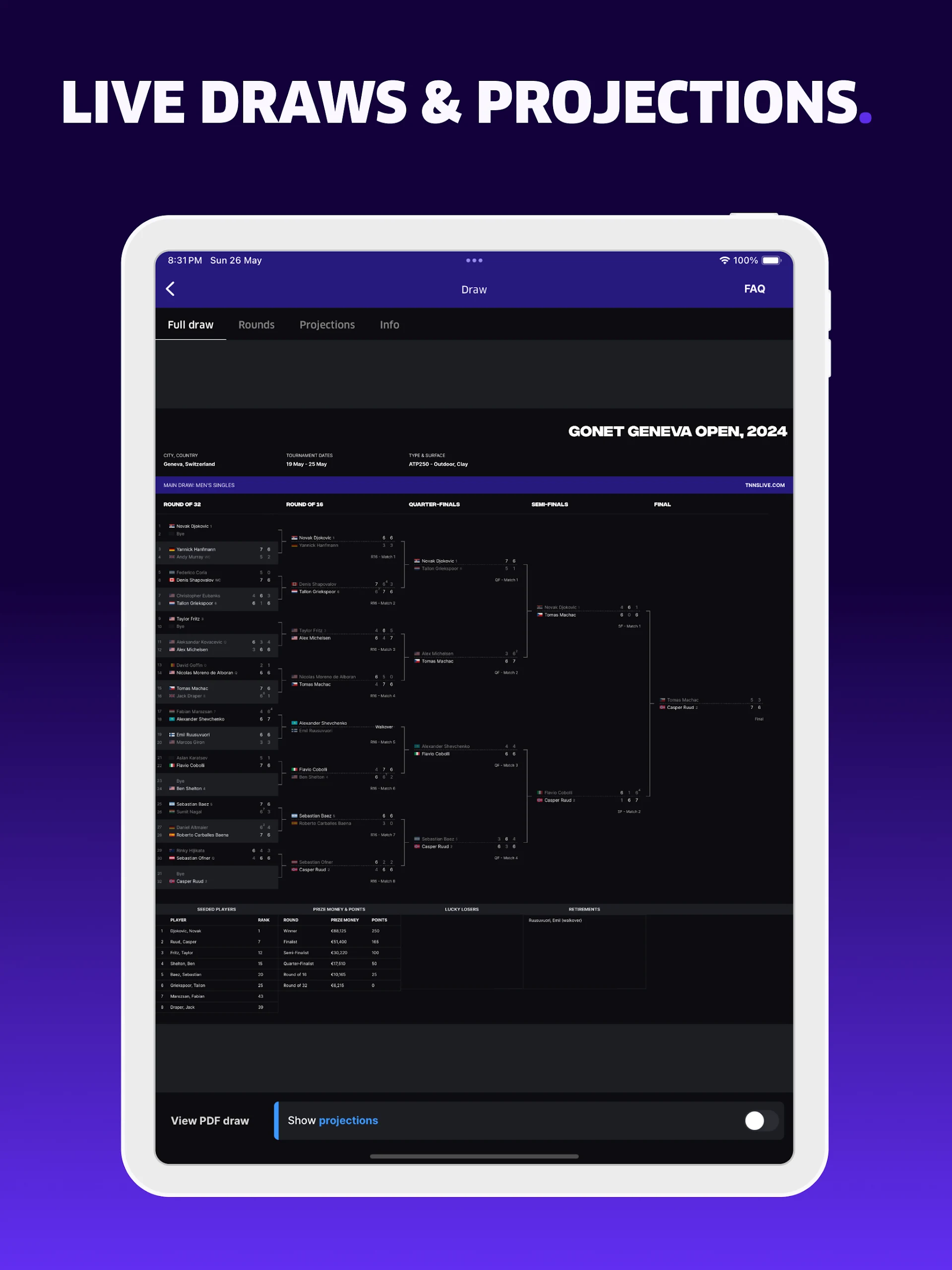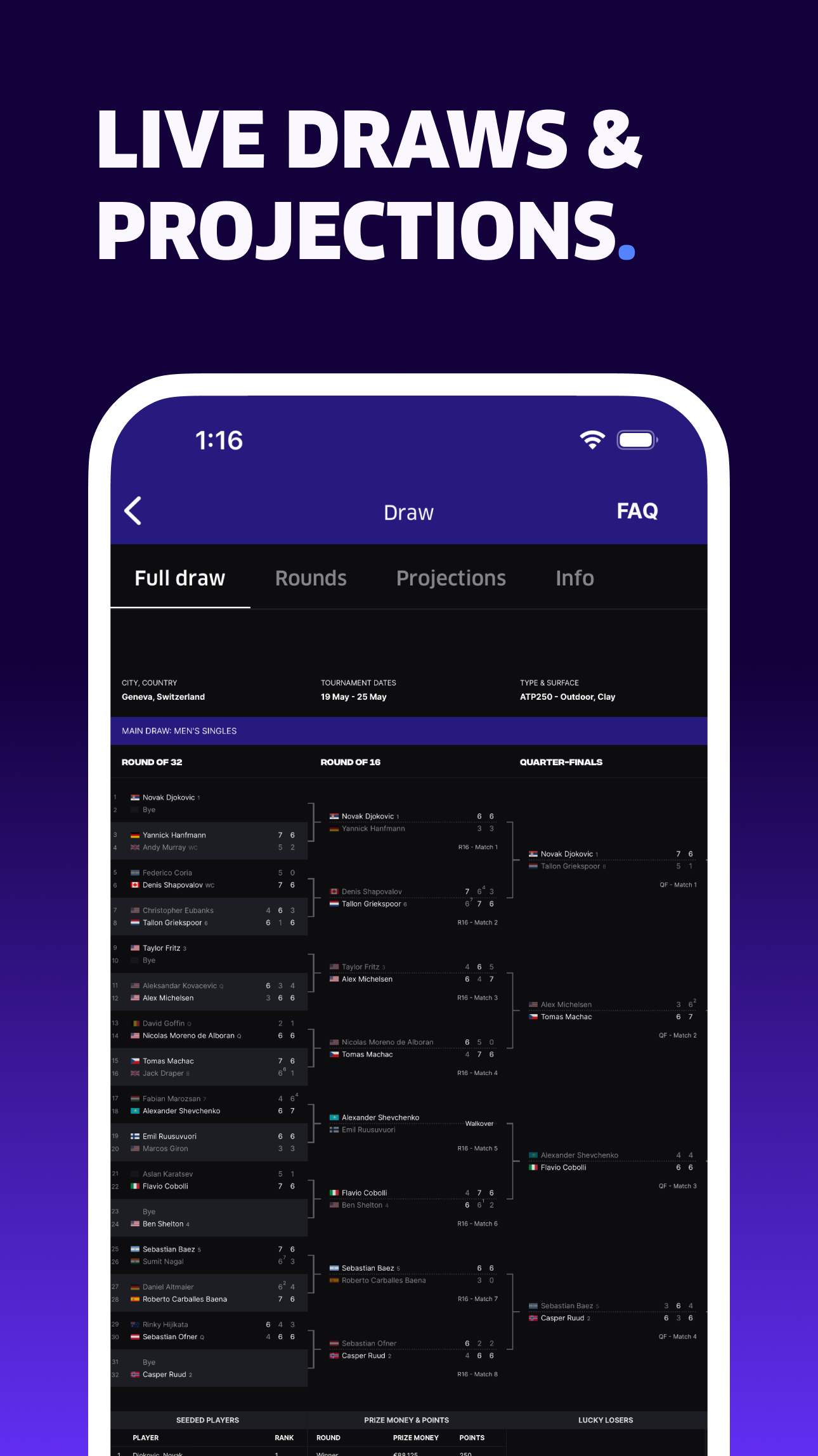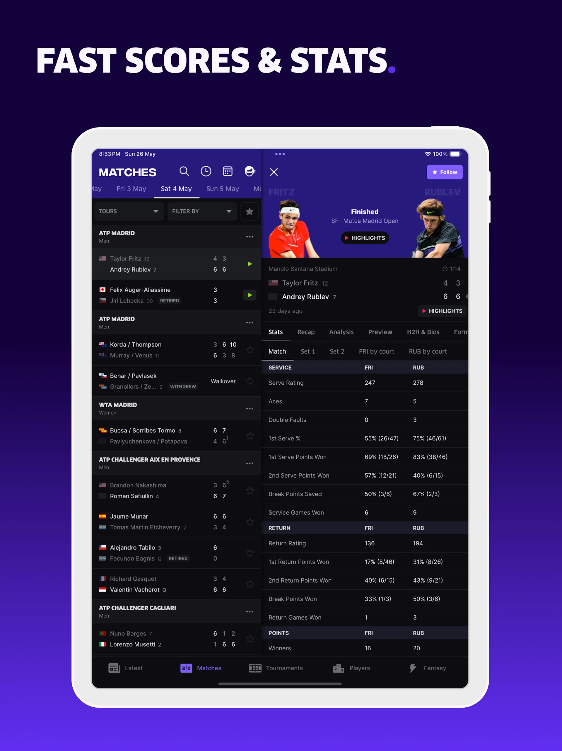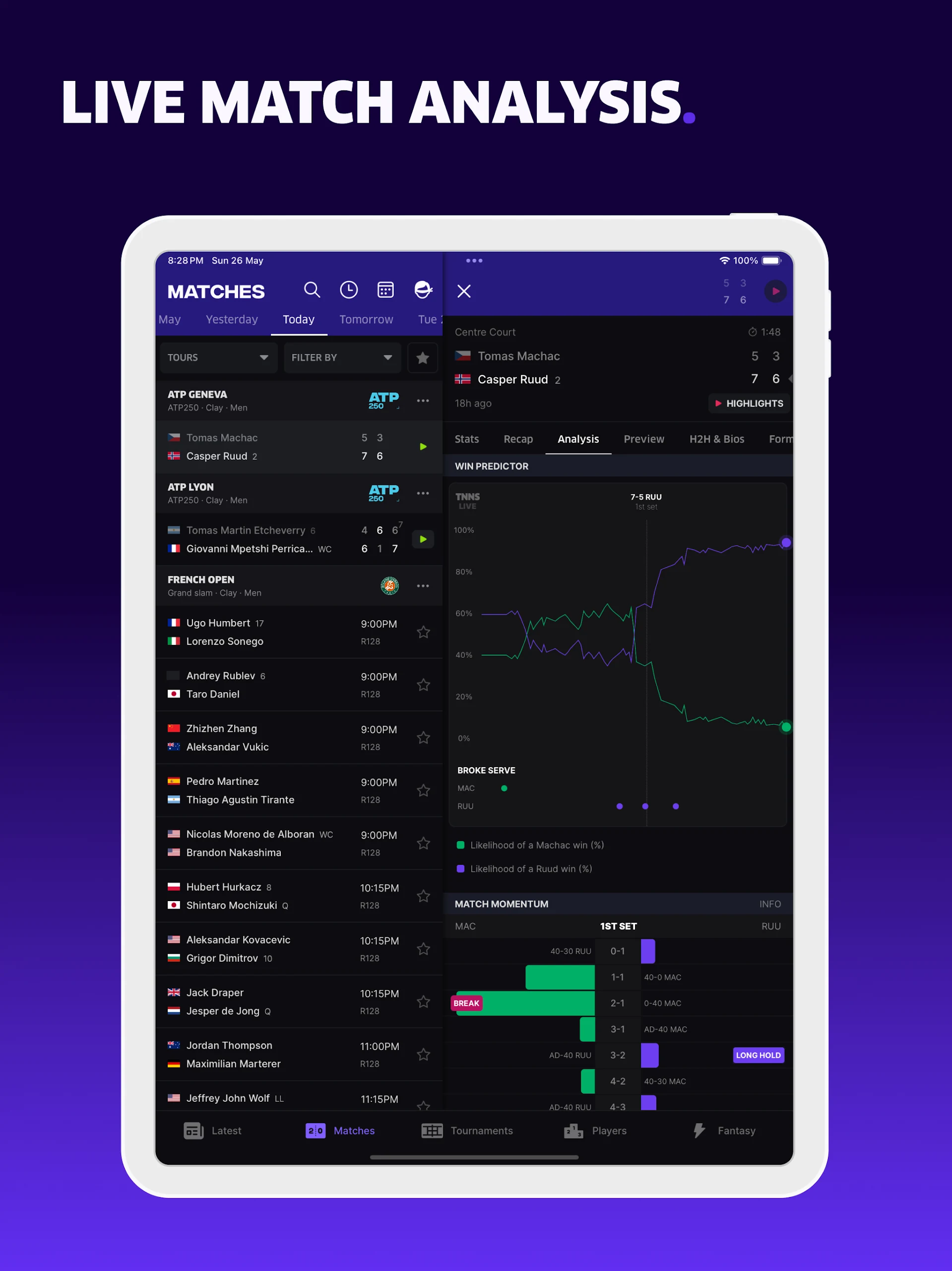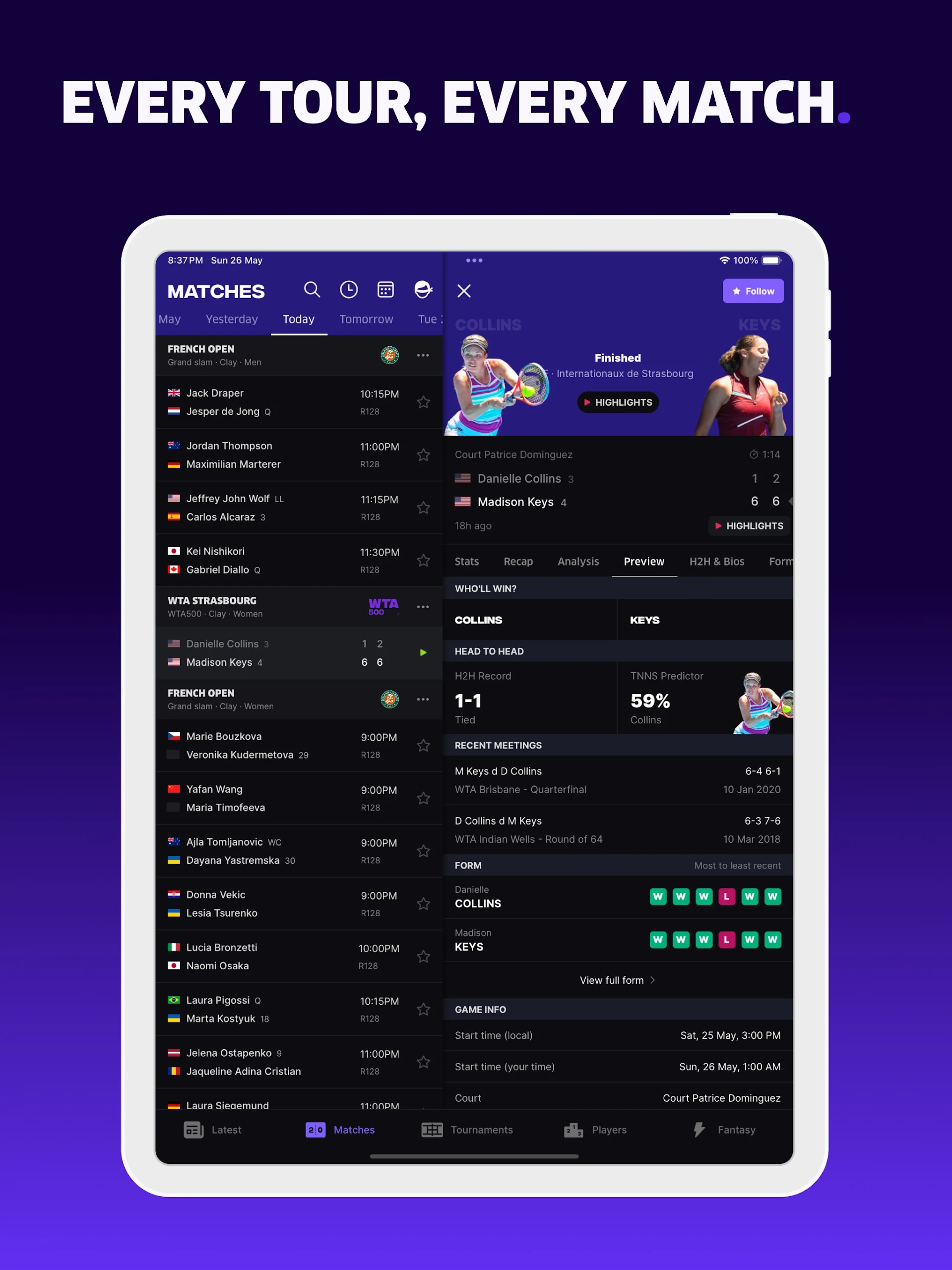 Access all the information you need about upcoming matches: live scores, extensive player statistics, current form, match recaps (including detailed point history), and head-to-head records are readily available in the match section.
