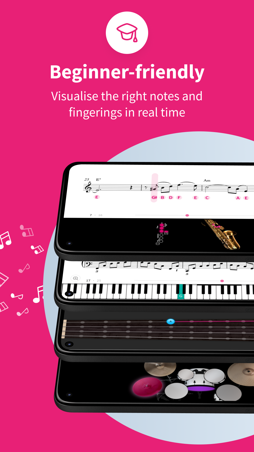 • Offers 26 different instruments: Piano, Violin, Flute, Oboe, Clarinet (in A, B-flat, or C), Harp, Cello, Trumpet (B-flat, C), Trombone (F-Clef, G-Clef), Viola, Accordion, Bassoon, Tuba, French horn, Euphonium, Tenor Horn, Recorder (Soprano, Alto, Tenor), Saxophone (Soprano, Alto, Tenor, Baritone), Double bass, Guitar (both acoustic and electric), Bass, Ukulele, Percussion instruments, Drums, and Singing. Also available for Bands, Ensembles, and Choirs