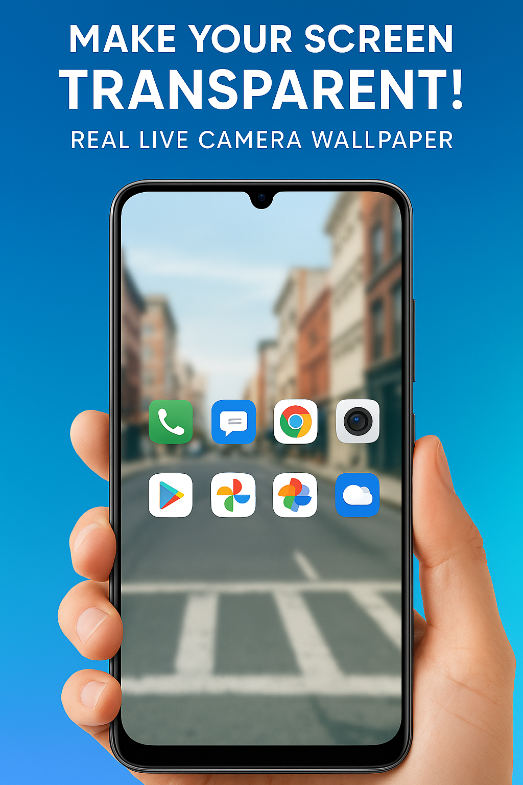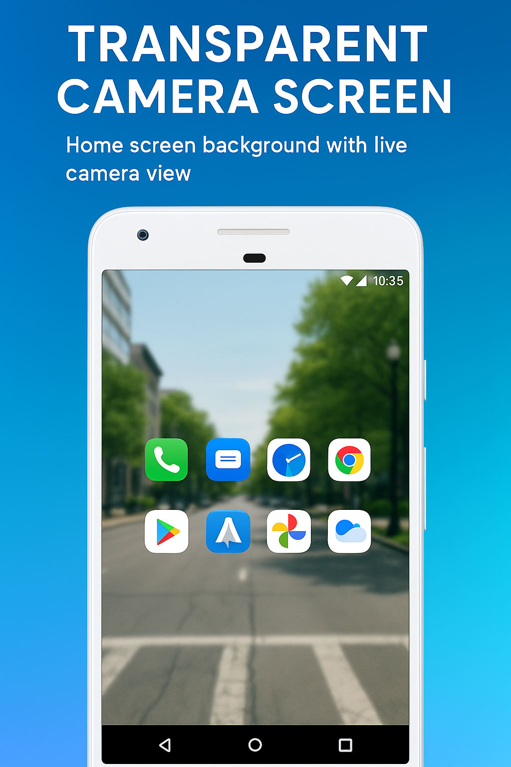 Transparent Camera Screen is a versatile application merging a camera and wallpaper with diverse categories. It enables you to achieve a transparent screen appearance using your phone camera. Transform your smartphone screen into transparency with this innovative app. Seamlessly navigate your phone as usual, allowing you to walk and text simultaneously through the wallpaper. This app invites you to enjoy your surroundings by incorporating them as your screen background. Carry on using your phone effortlessly, all while viewing the live camera image transparently across the entire screen. Access your applications such as phone, contacts, text messages, and internet browsers easily using shortcuts created on the home screen. We have provided you with an optimized home screen substitute that is user-friendly and serves as a lightweight launcher for Android. Explore other dynamic live wallpapers like Rain Drop Wallpaper, Scenic Nature Live wallpaper, and more with this app. Enjoy a selection of HD Rain frames where you can insert your own pictures and set them as your home screen wallpaper, creating a rain effect on your images.