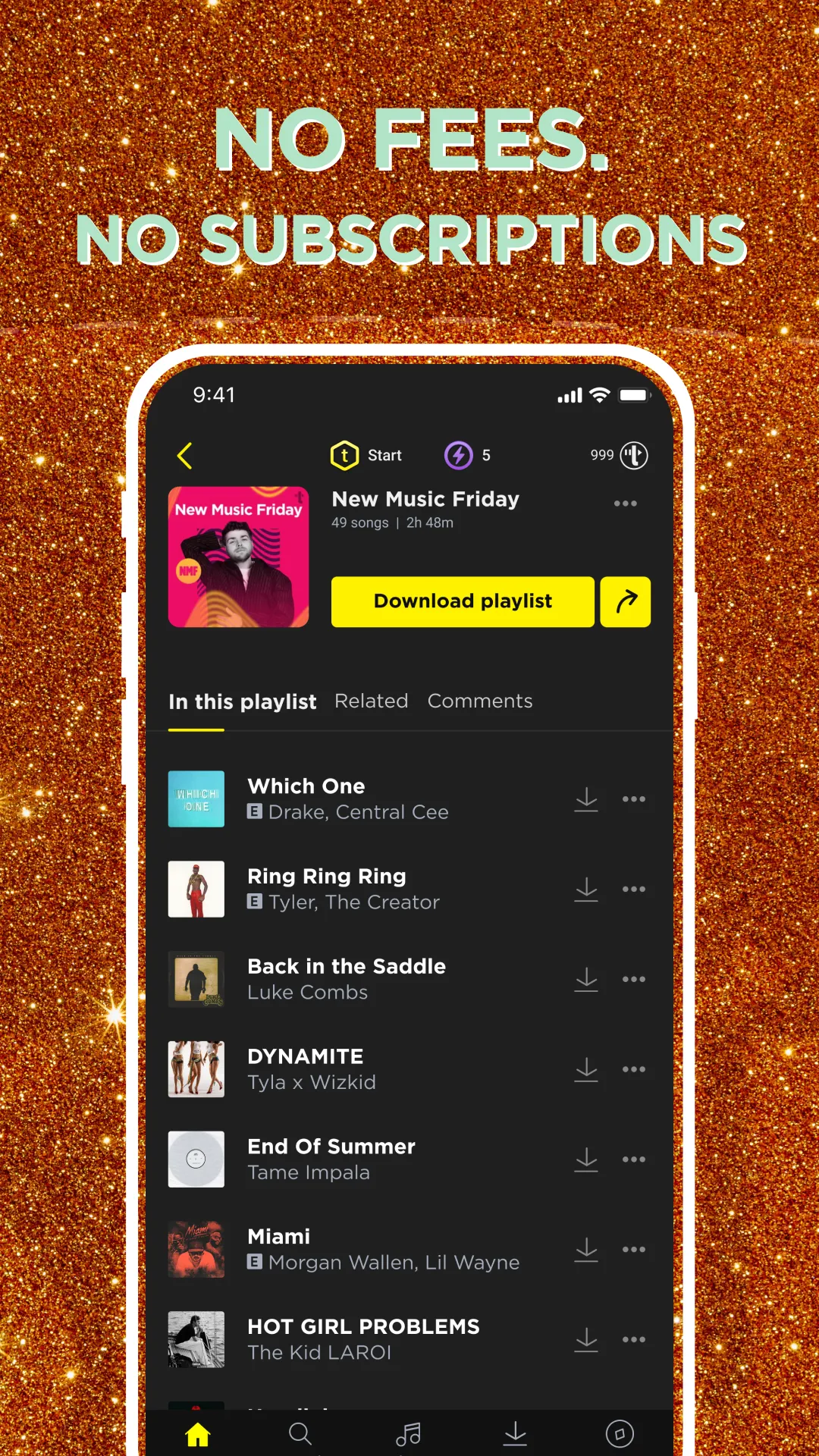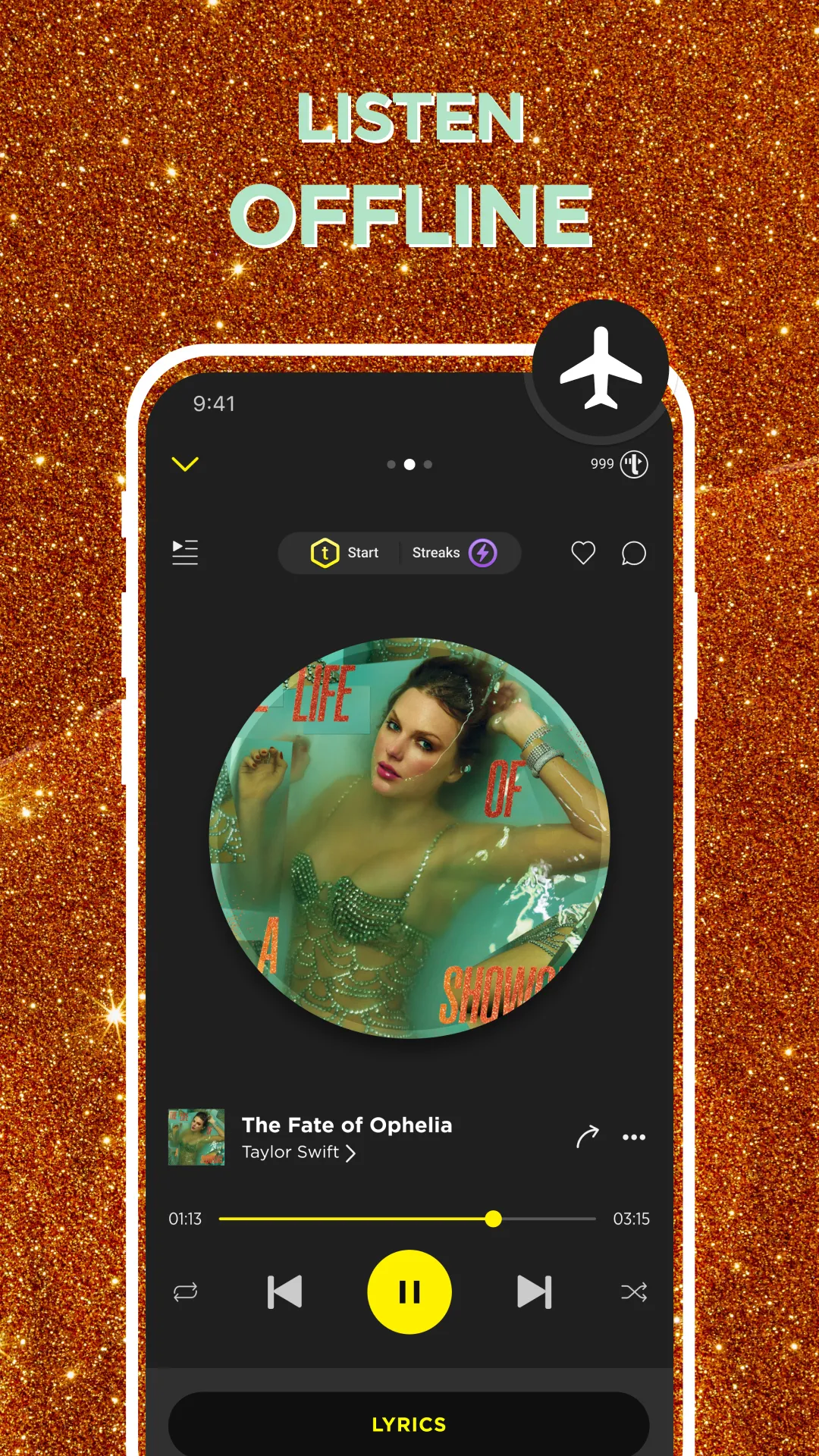 • Play offline (no data or Wi-Fi connection needed after downloading music)