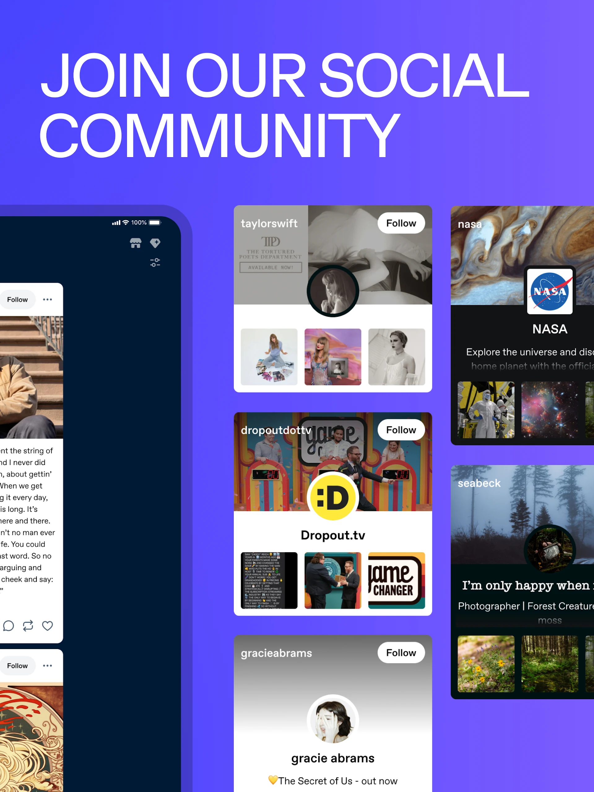 Express yourself freely — share thoughts on astrology, fanfiction, or showcase your beloved pet turtle Harold. Utilize different media formats such as photos, videos, text, audio, or even music from Spotify. Join engaging discussions or start intriguing conversations with our preset chat post feature.