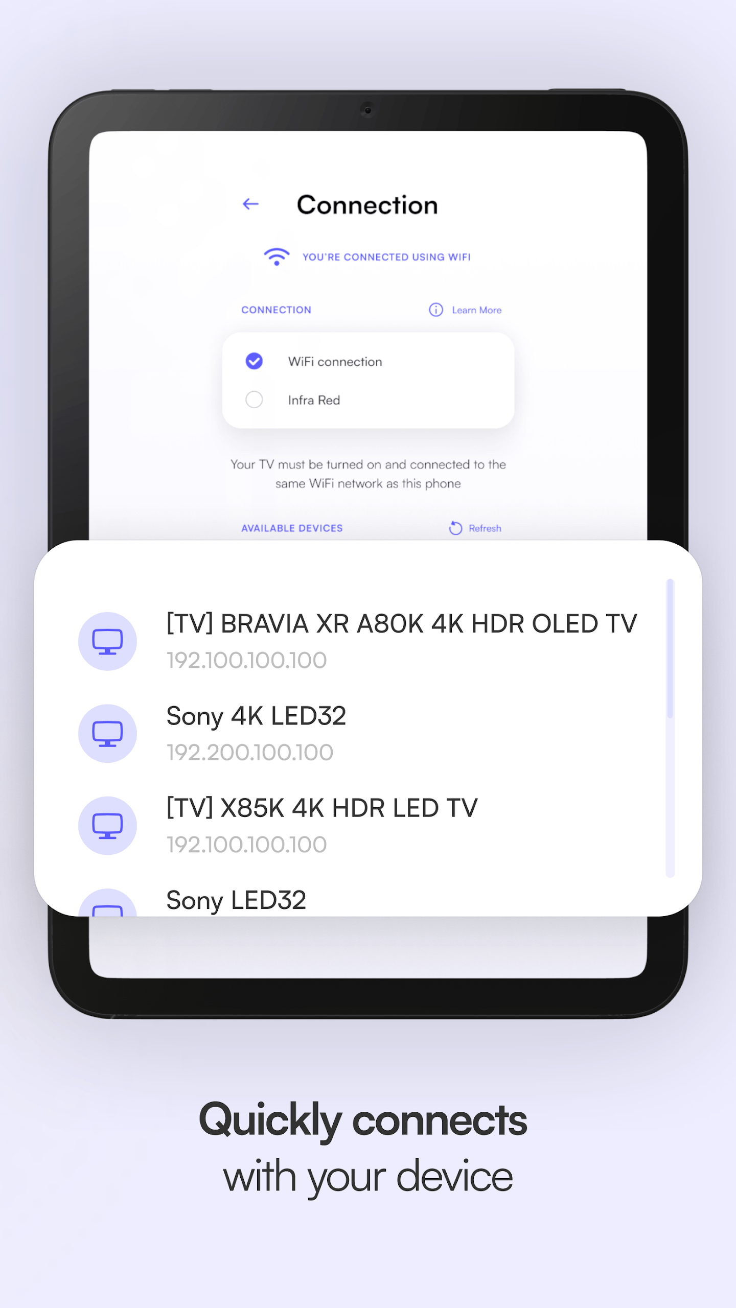 -- It connected and saw my TV almost instantly on wifi. Sony app or any other app couldn't find and connect so easily. Unlike what I have seen commented on other apps, it appears I have full control of my TV thru this app, including apps, so I won't need to buy yet another remote, which I tend to lose anyway. 😅 I recommend this if you are totally frustrated with other apps because it may work for you, too. Also,there is an infrared option if wifi is troubling you. Comments says it works well.🙏