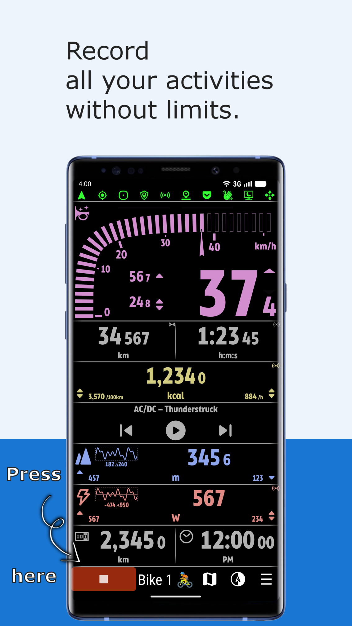 Track bike routes, calories burned, and total distance traveled in style.