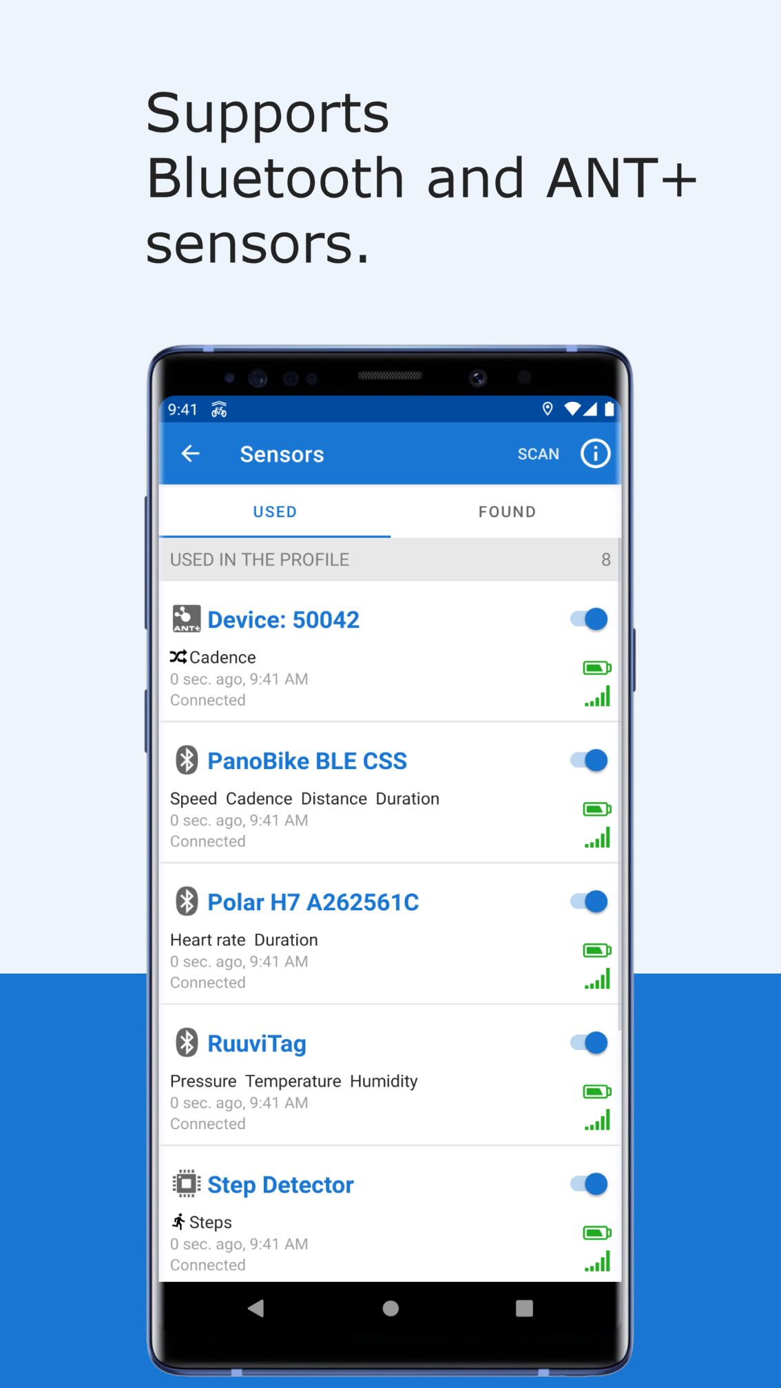 • Wireless Sensors – support for Bluetooth Smart and ANT+ sensors.