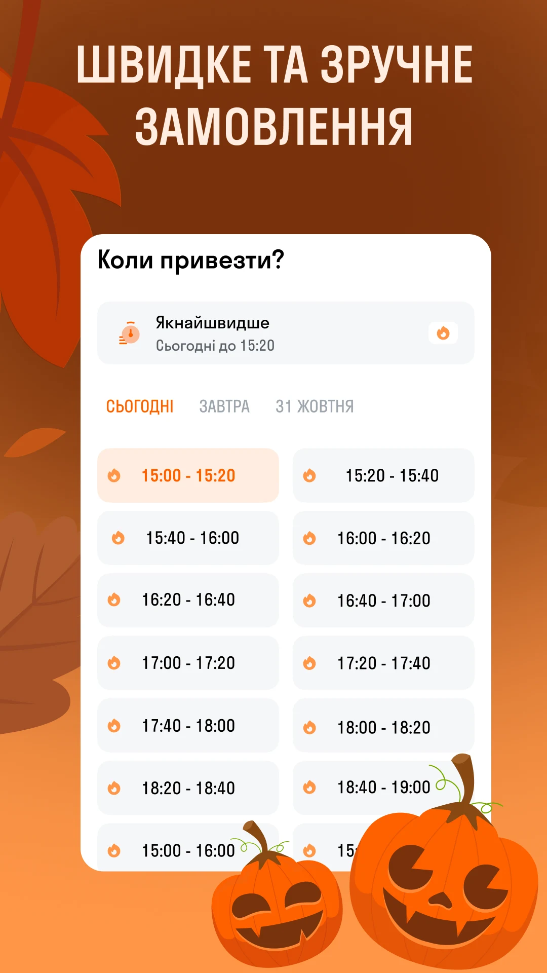 Delivery time – indicate a convenient time interval for you when you want to receive the order. Choose a convenient delivery slot on the site with a 20-minute time interval for courier delivery and self-pickup.