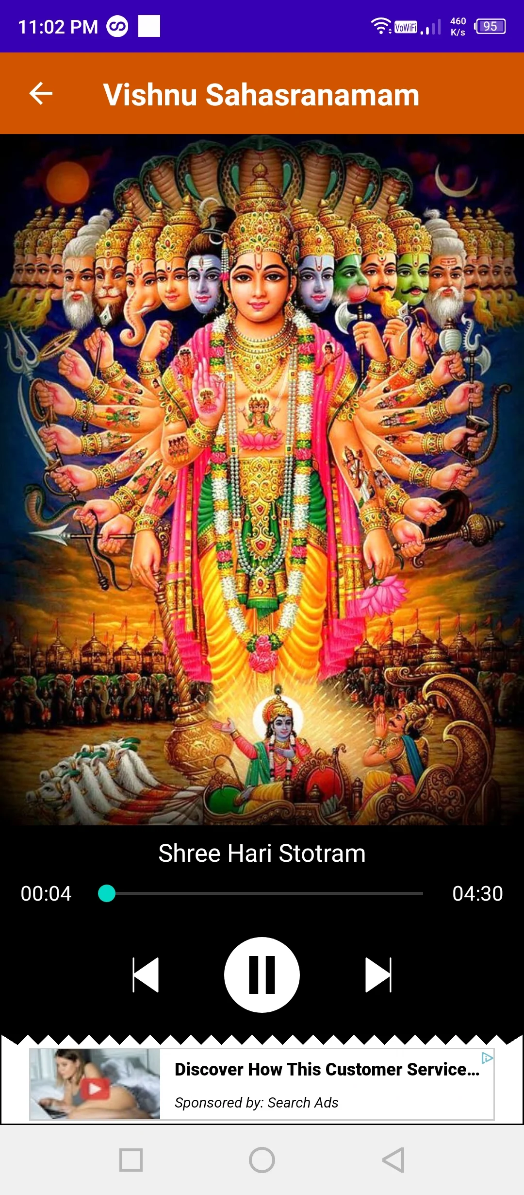 Vishnu Sahasranamam by Ini is a devotional audio app that lets users listen to the sacred recitation of the thousand names of Lord Vishnu. It includes a clear meditation voice track, buttons to skip forward or back, and a progress bar to navigate the audio. Background playback is supported, and you can control the audio from the notification area. There is also a “set as wallpaper” feature (for visuals), sharing options, and a user-friendly layout.