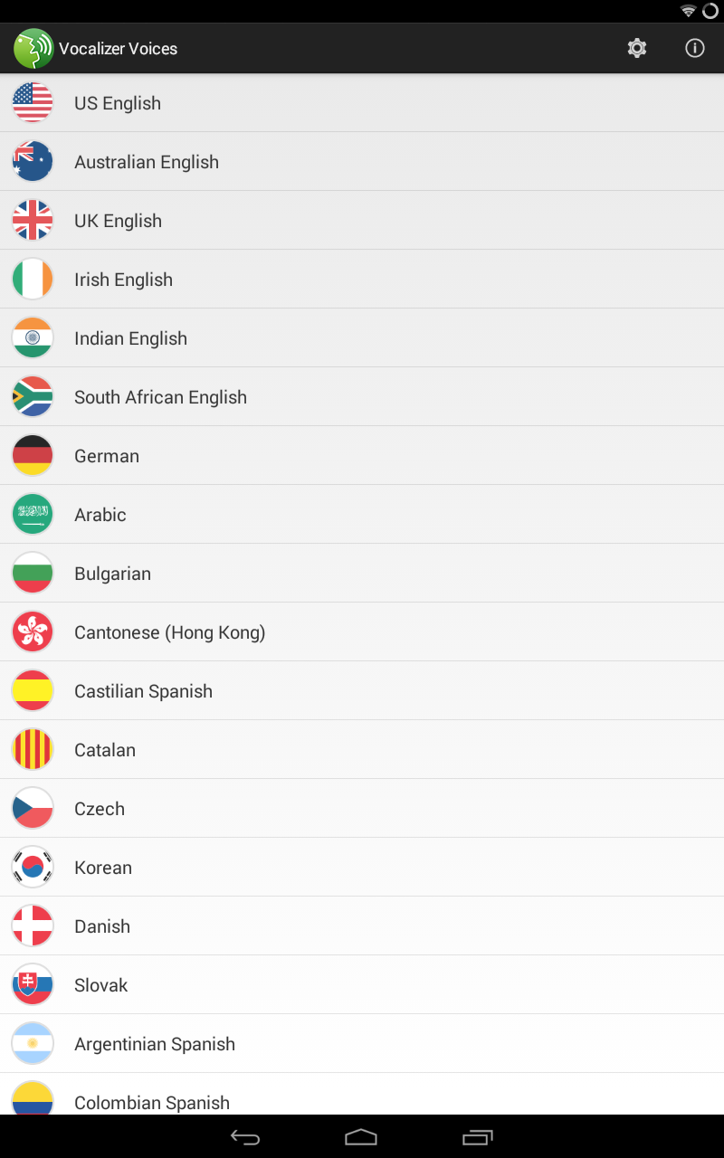 US English, Australian English, Indian English, Irish English, South African English, Scottish English, UK English, Argentinian Spanish, Castilian Spanish, Chilean Spanish, Colombian Spanish, Mexican Spanish, Arabic, Bengali, Bhojpuri, Catalan, Croatian, Basque, Galician, Dutch, Belgian Dutch, Kannada, Portuguese, Brazilian Portuguese, Bulgarian, French, Canadian French, Cantonese (Hong Kong), Mandarin, Mandarin Taiwanese, Czech, Danish, Finnish, German, Greek, Hebrew, Hindi, Hungarian, Indonesian, Malay, Italian, Japanese, Korean, Marathi, Norwegian, Polish, Romanian, Russian, Slovak, Swedish, Thai, Tamil, Telugu, Turkish, Ukrainian, Valencian.