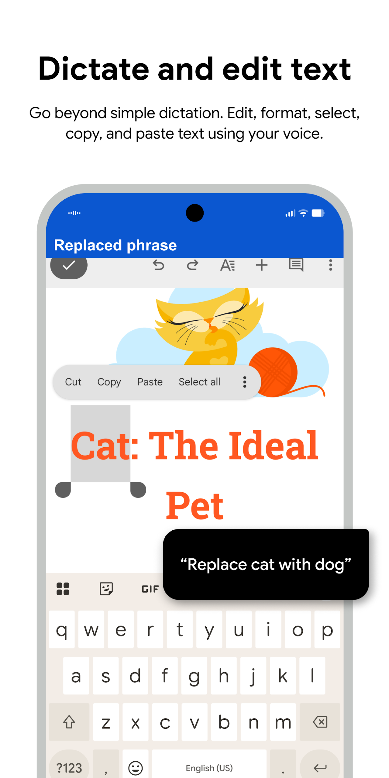Text Editing and Dictation:Commands such as "type hello," "replace coffee with tea."