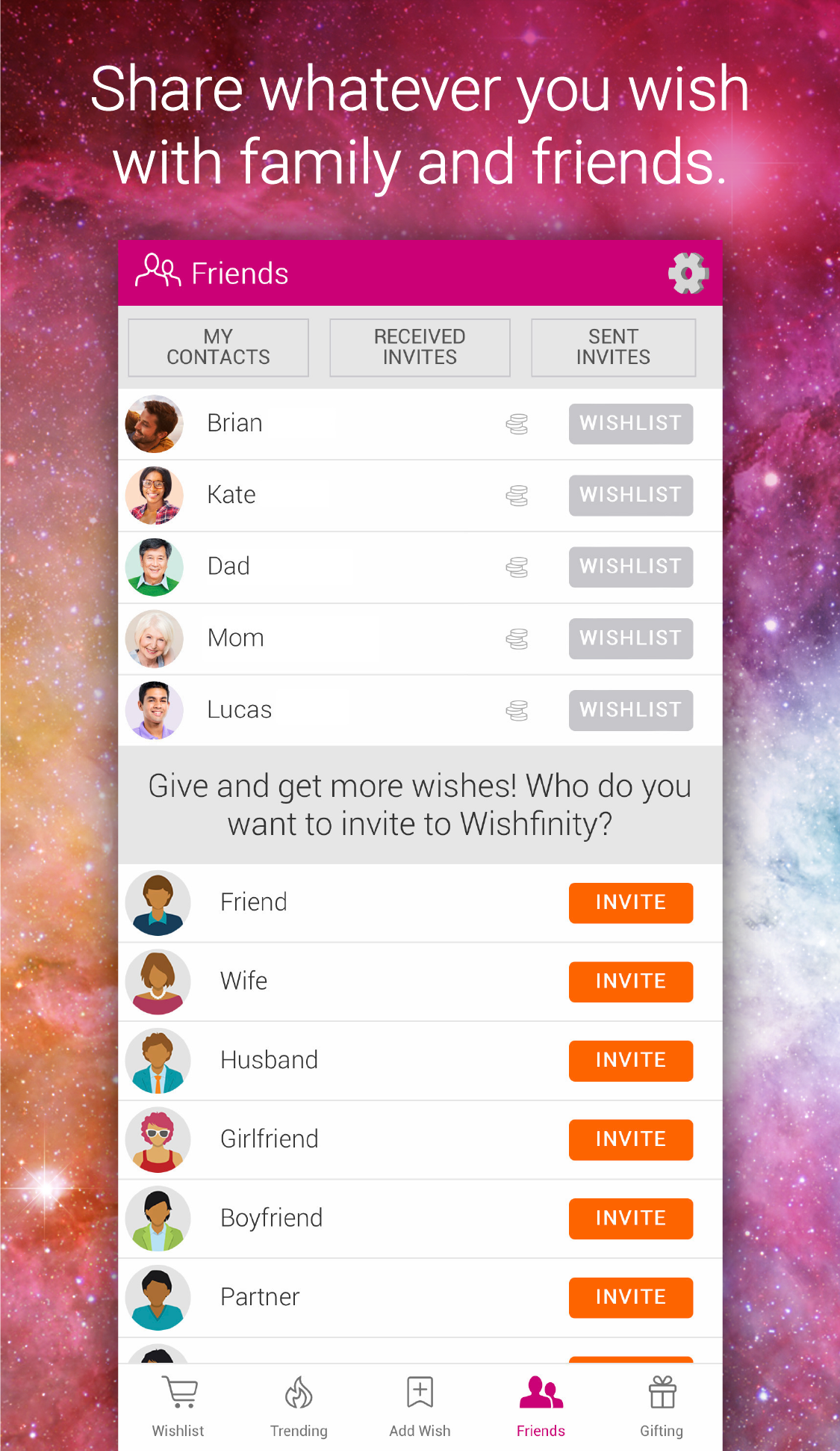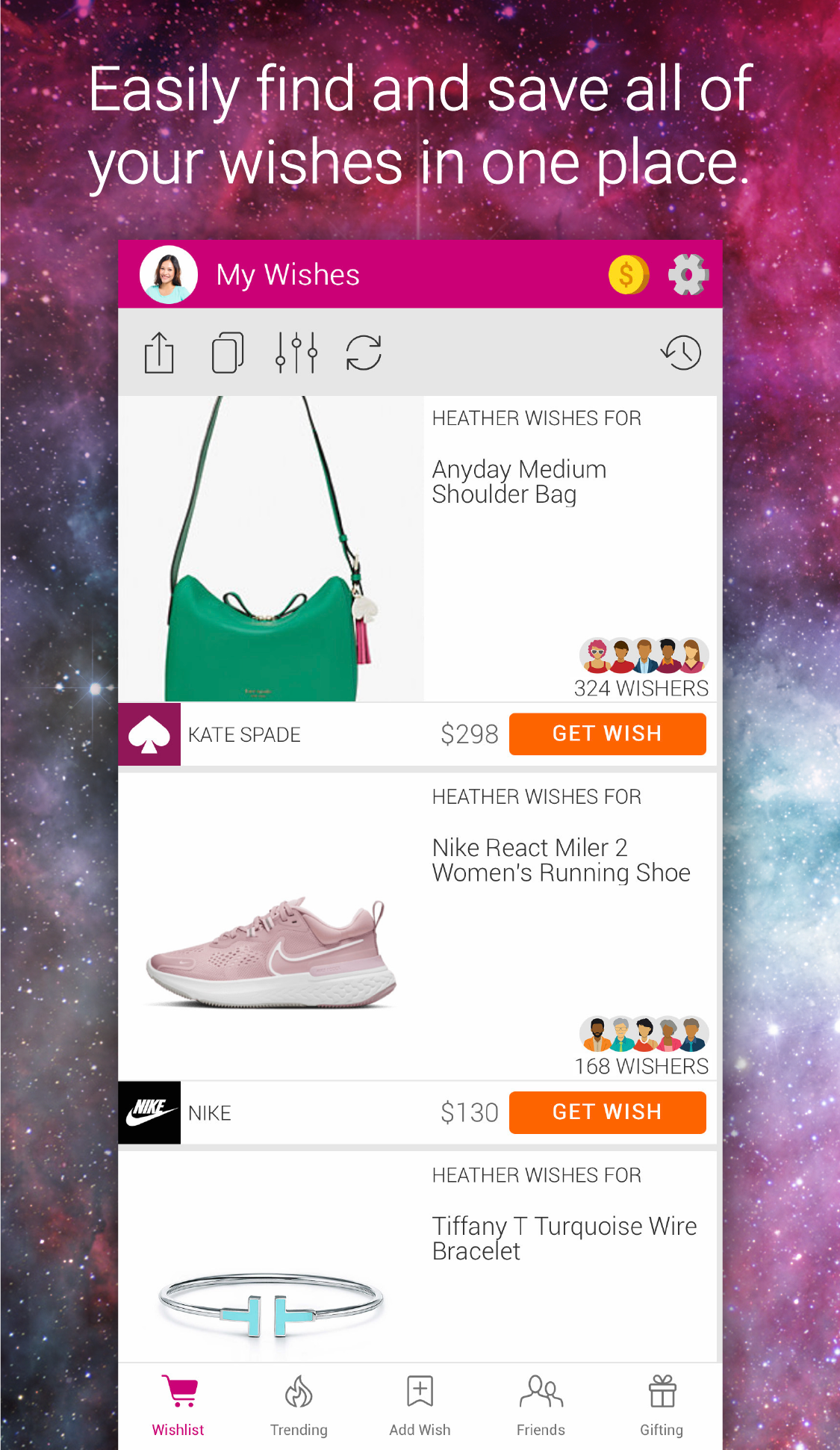 • Share your wishlist quickly using text messaging, emails, or social media platforms.