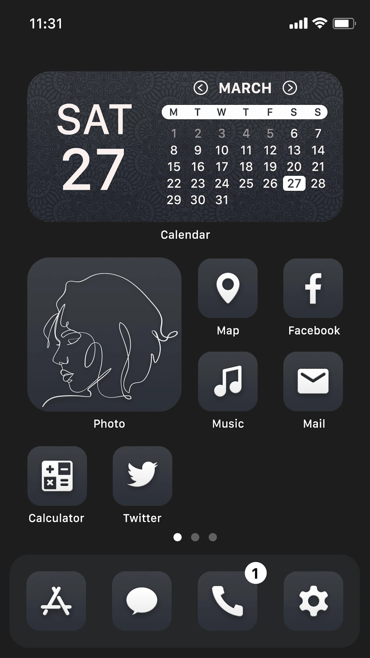 - Offers three widget options: calendar, photo, clock, and additional designs that align with the black theme.