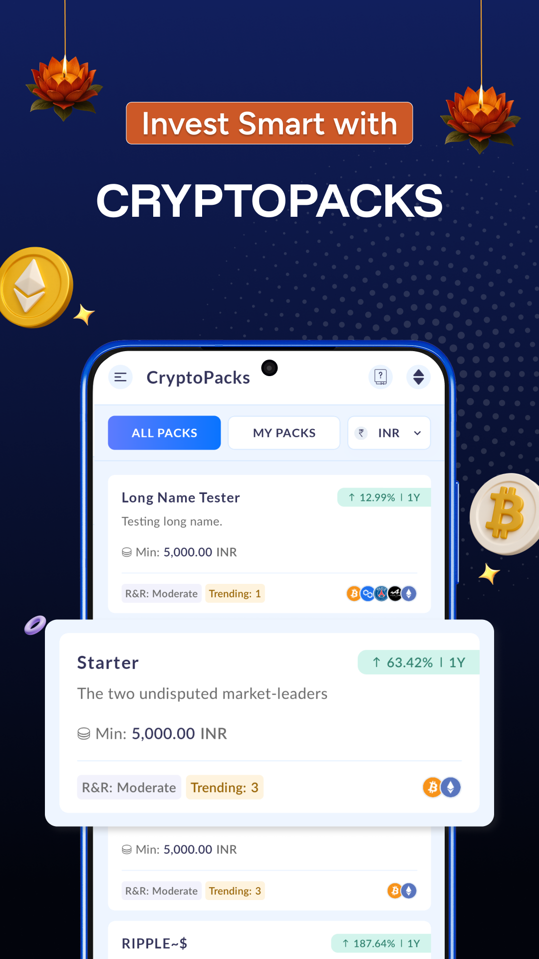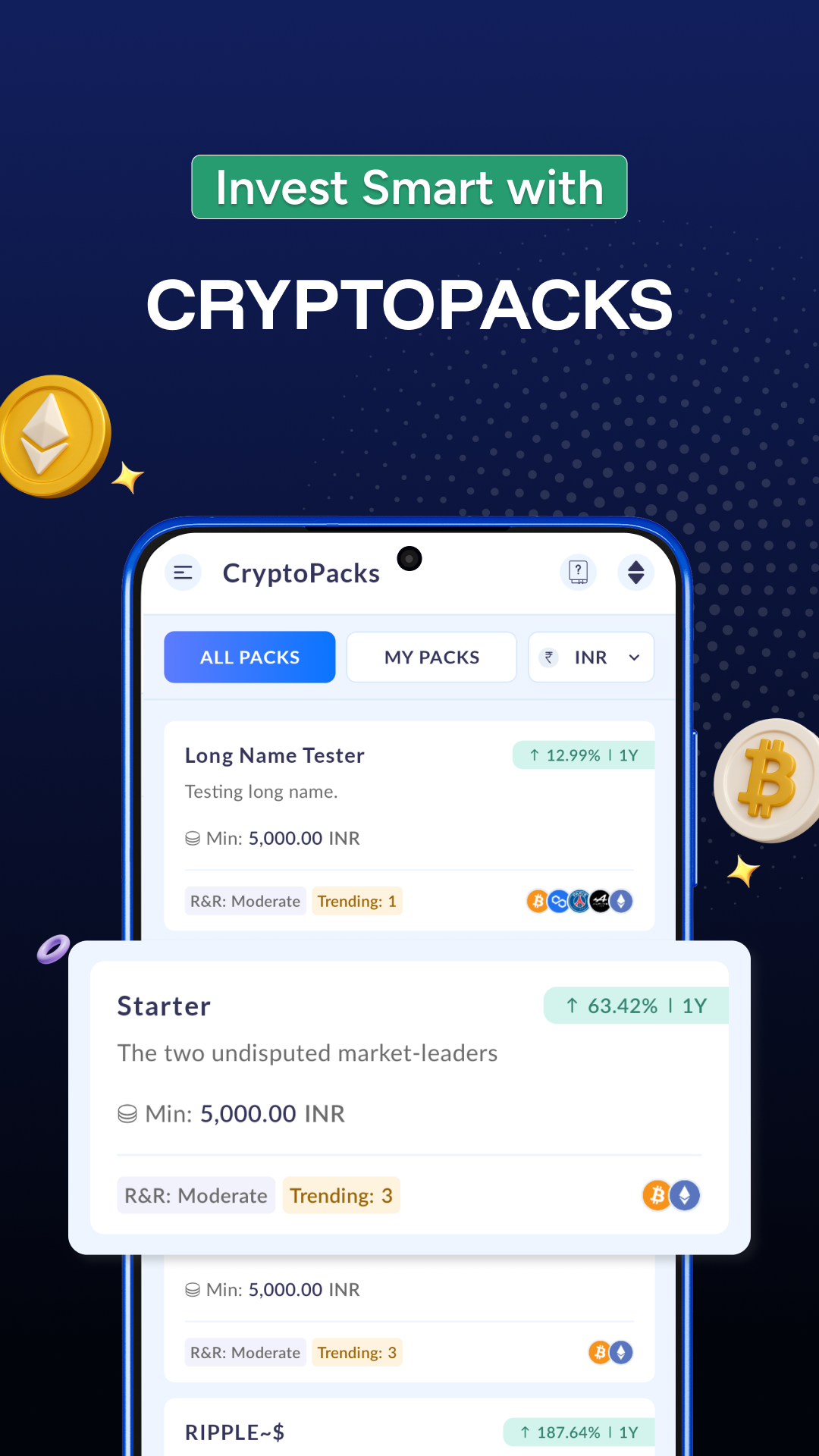 ● CryptoPacks: Invest wisely through diversified bundles featuring top-performing cryptocurrencies such as Bitcoin, Ethereum, BNB, and Solana—ideal for those looking to make strategic investments.
