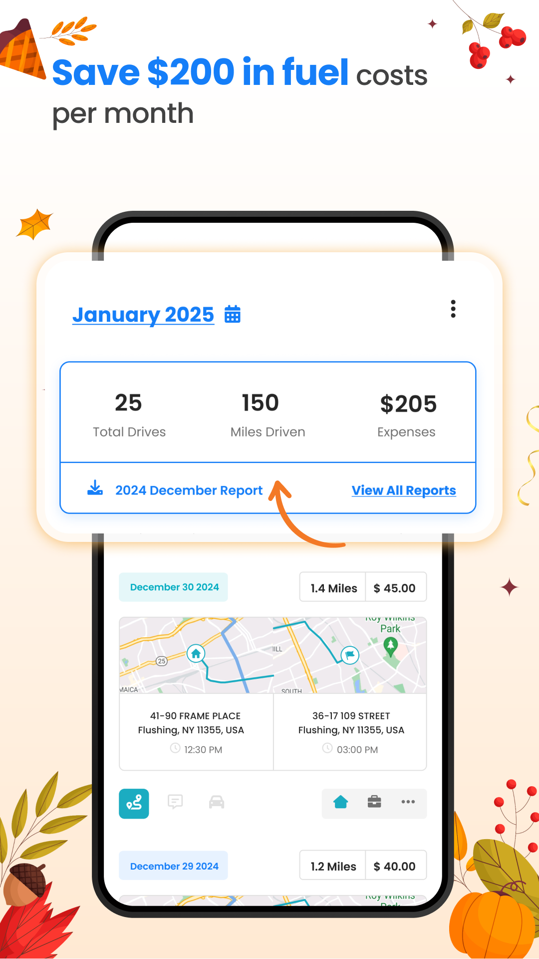 Access reports about your trip - including distance, duration, stop details, mileage, hard braking instances, and driver performance.