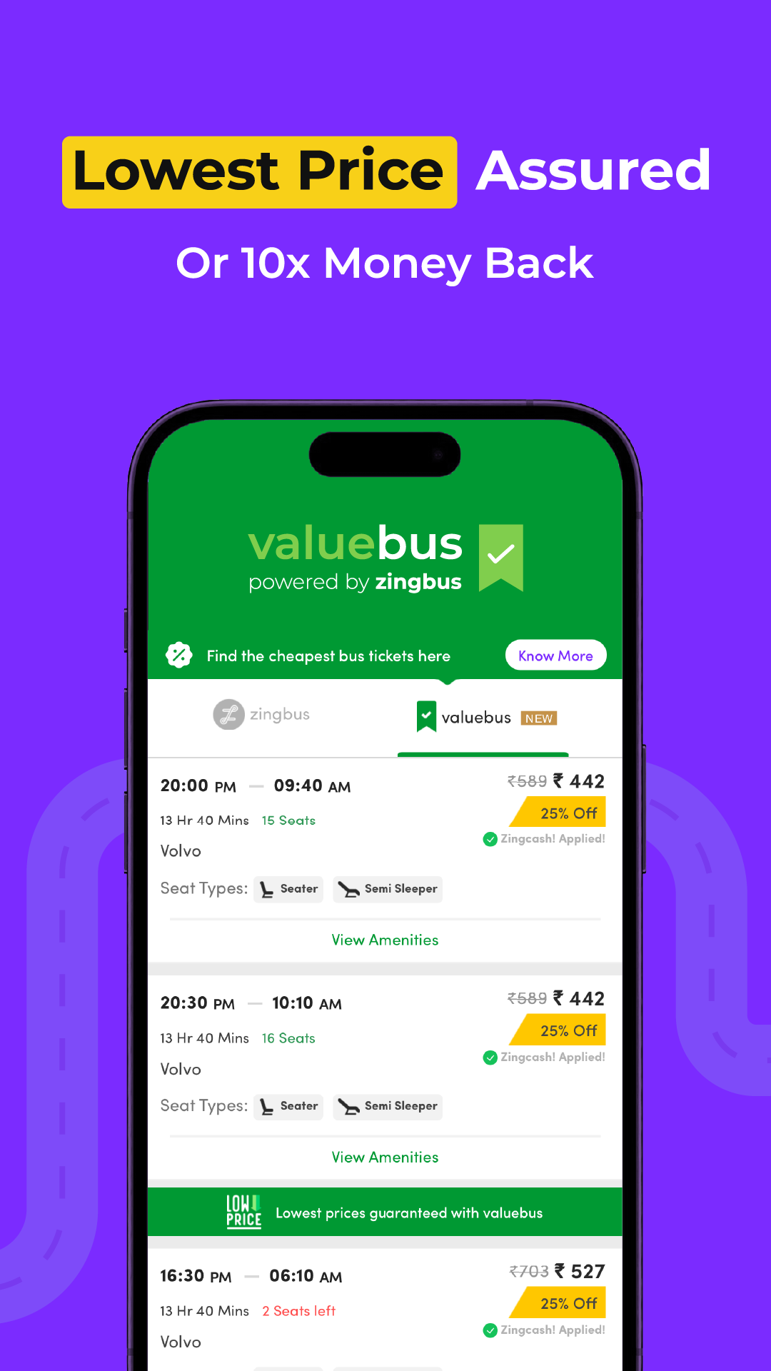 - Lowest Price Guarantee: Find a cheaper fare on another Indian bus booking platform within 24 hours, and we’ll refund you 10 times the price difference.