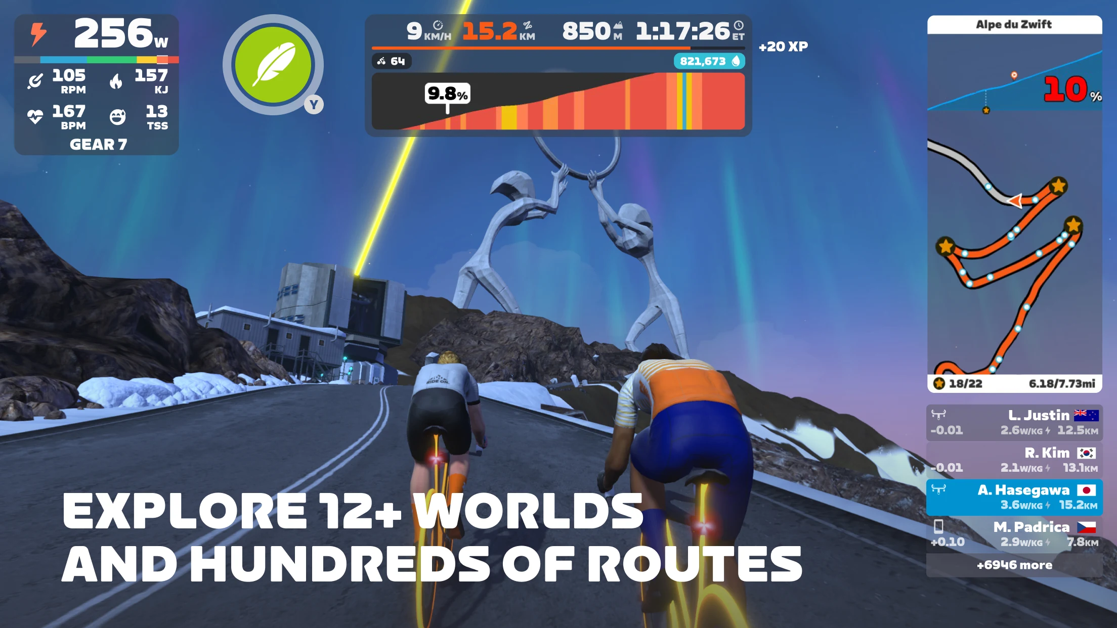 Embark on journeys across more than a hundred routes within 12 immersive, virtual worlds. Whether it's the demanding ascents of Watopia or the tranquil landscapes of the Scottish highlands, each ride offers a fresh opportunity for exploration.